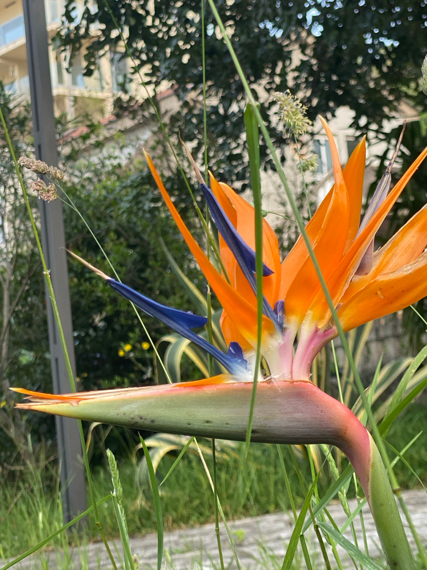 The image presents a detailed close-up of a vibrant Bird of Paradise flower (Strelitzia reginae) set against a soft, blurred background. The flower is oriented horizontally within the frame, showcasin…read more