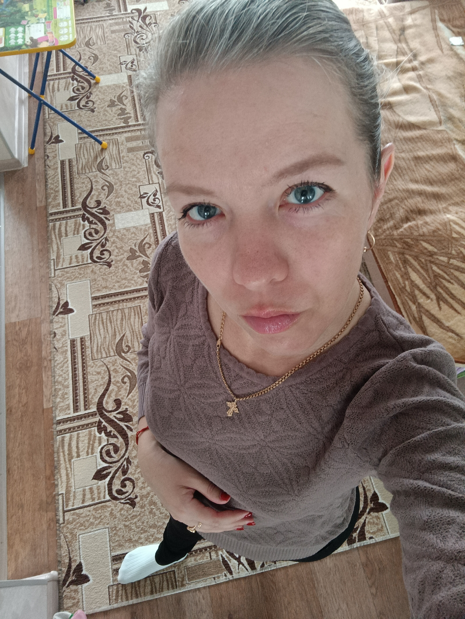 A fair-skinned woman with short, gray hair and blue eyes is looking directly at the camera in an indoor setting. She is wearing a brown long-sleeved sweater and a gold necklace with a cross pendant. H…read more