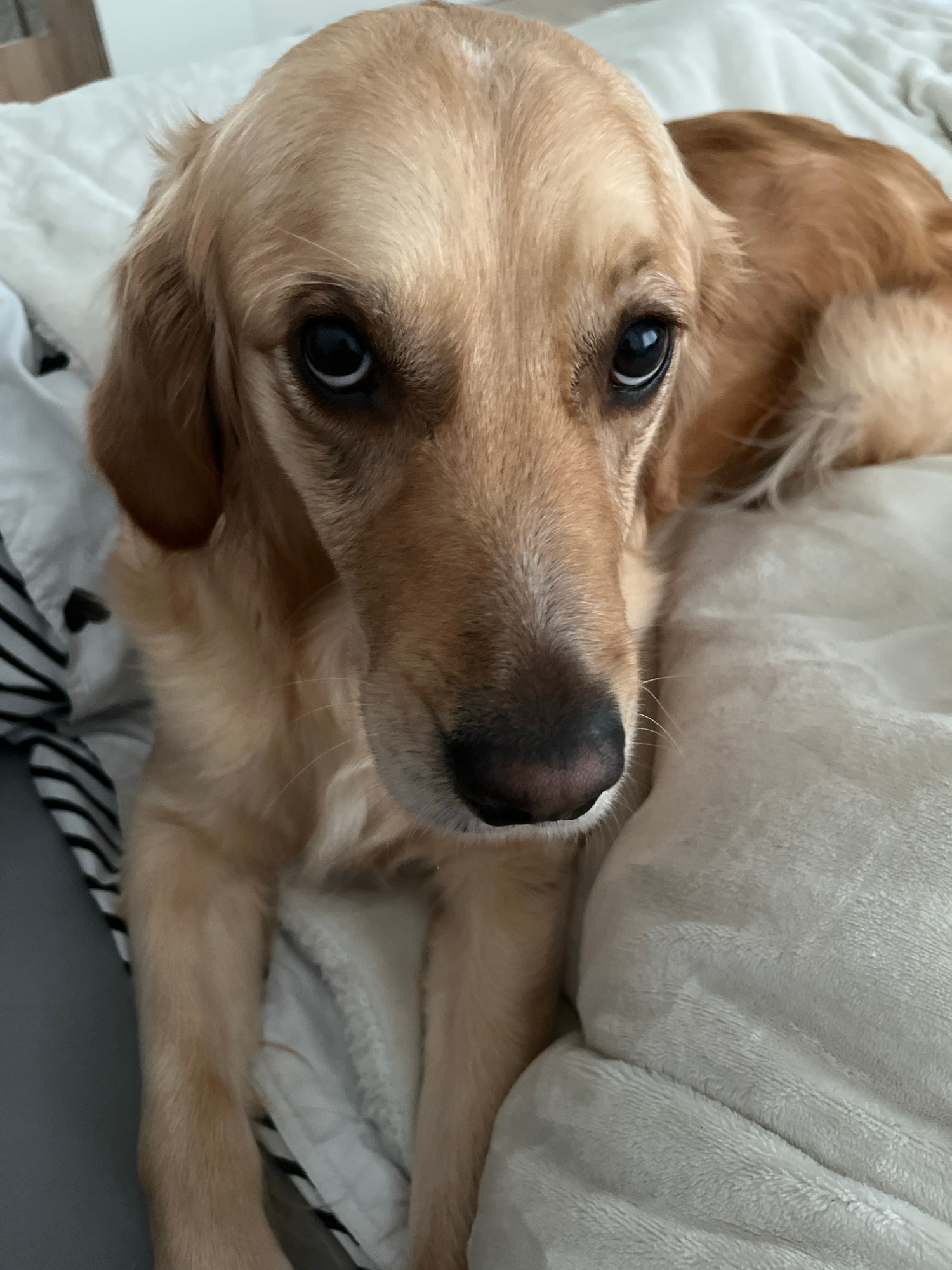 A close-up image shows a golden retriever dog lying on a bed. The dog is light brown with dark eyes and a black nose. It appears to be looking up at the camera. The dog is on a bed with a white, fluff…read more
