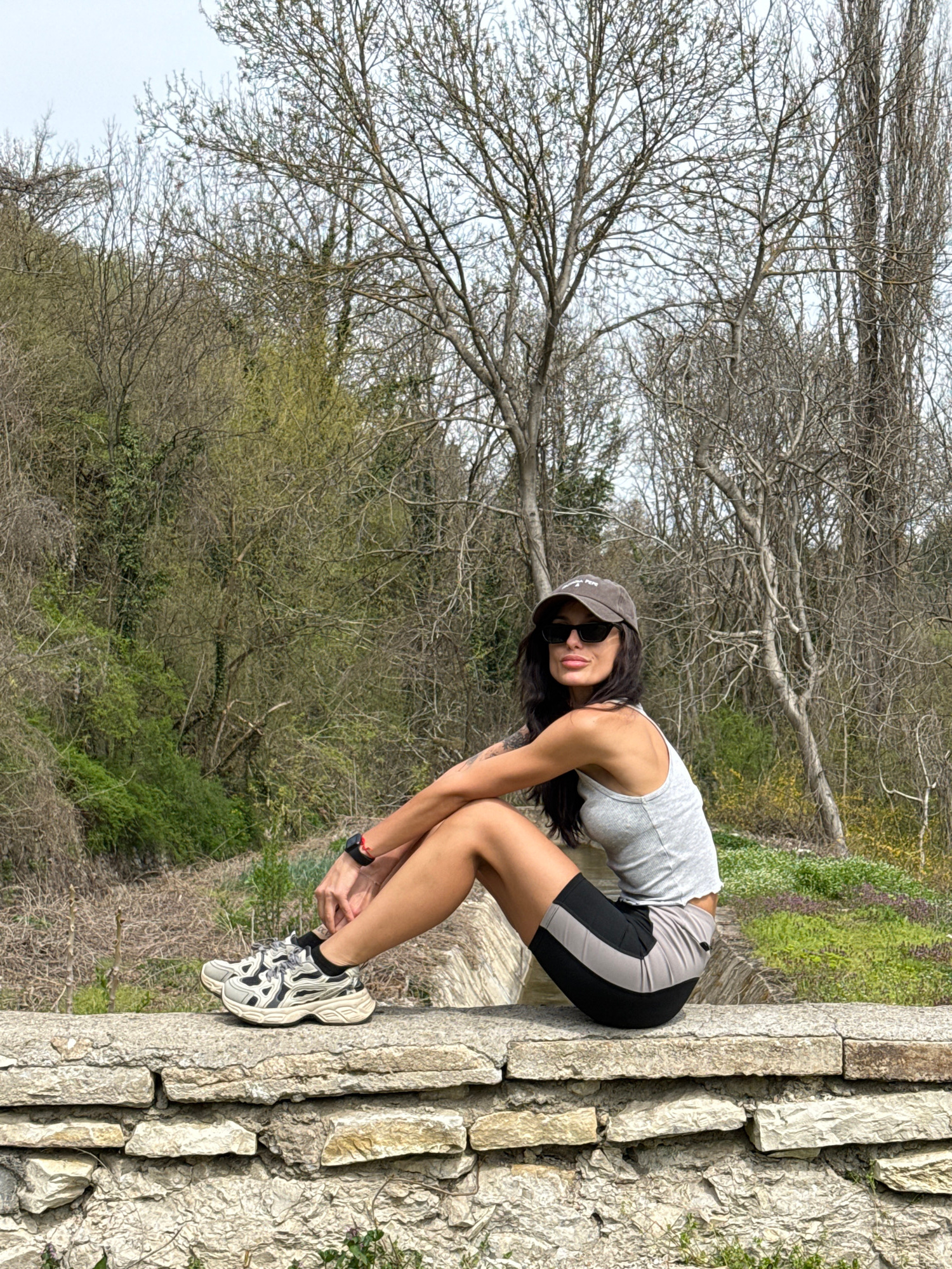 A slender woman is posed on a stone wall. She wears a gray tank top, black and gray athletic shorts, a dark baseball cap, and sunglasses. She is leaning forward, her hands holding her ankles. The back…read more