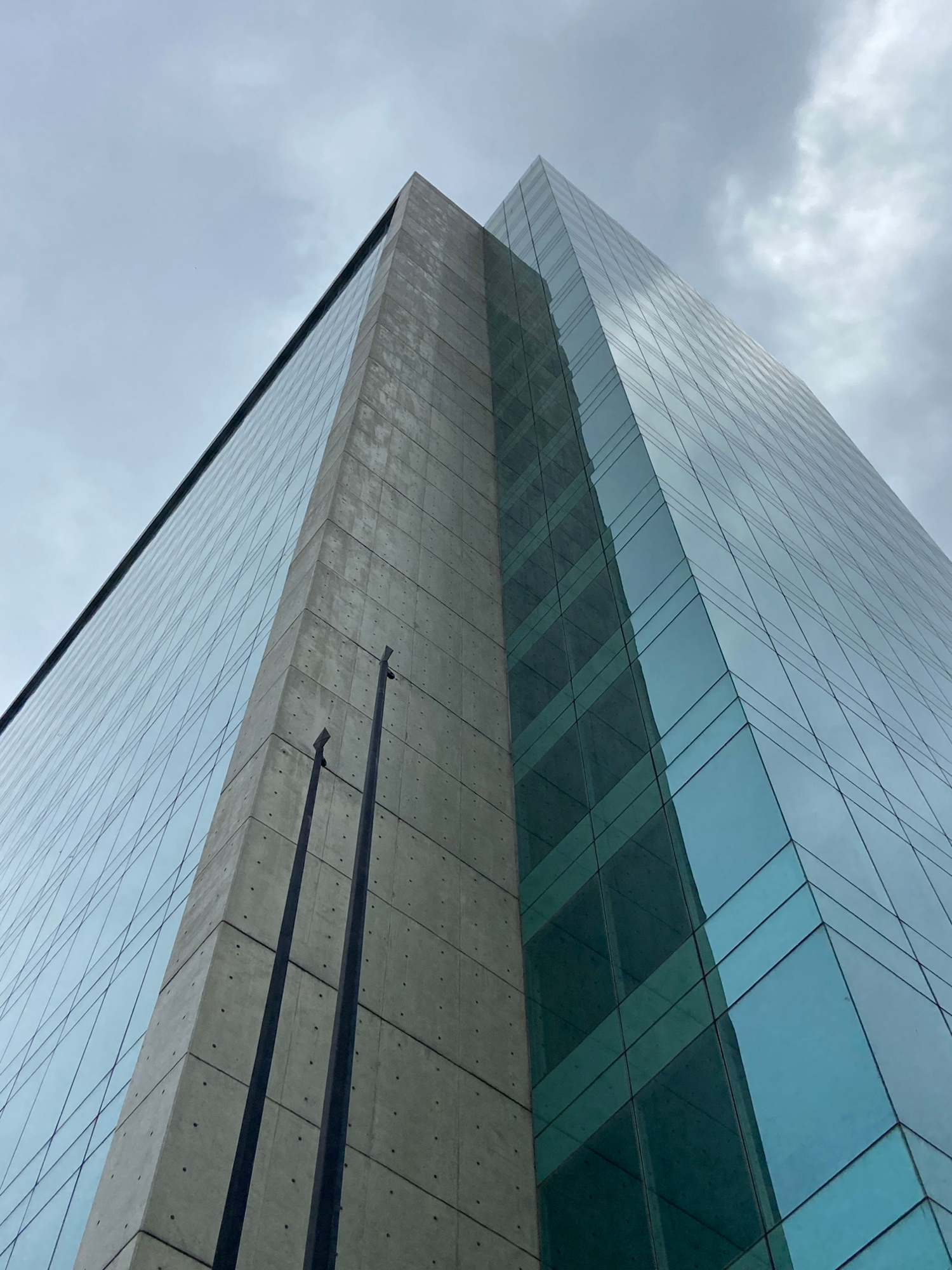 This is an architectural photograph of a modern building in Caracas, Venezuela, captured from a low-angle perspective looking upwards. The structure is characterized by its sharp, angular design and a…read more