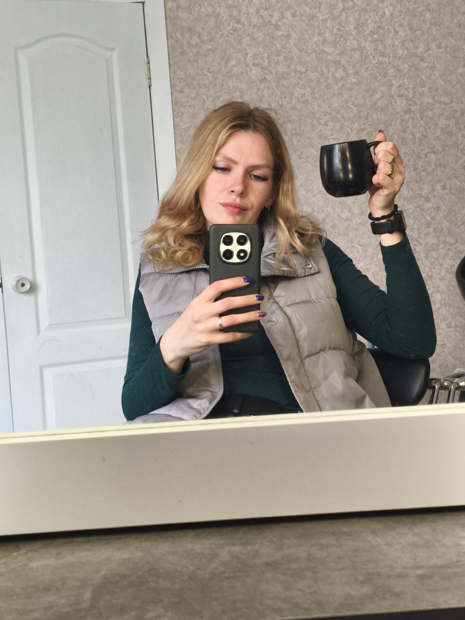 A young adult woman with long, wavy blonde hair takes a mirror selfie in an indoor setting, likely a salon or dressing room in Русский Вожой, Russia. She is reflected from the chest up, looking down a…read more