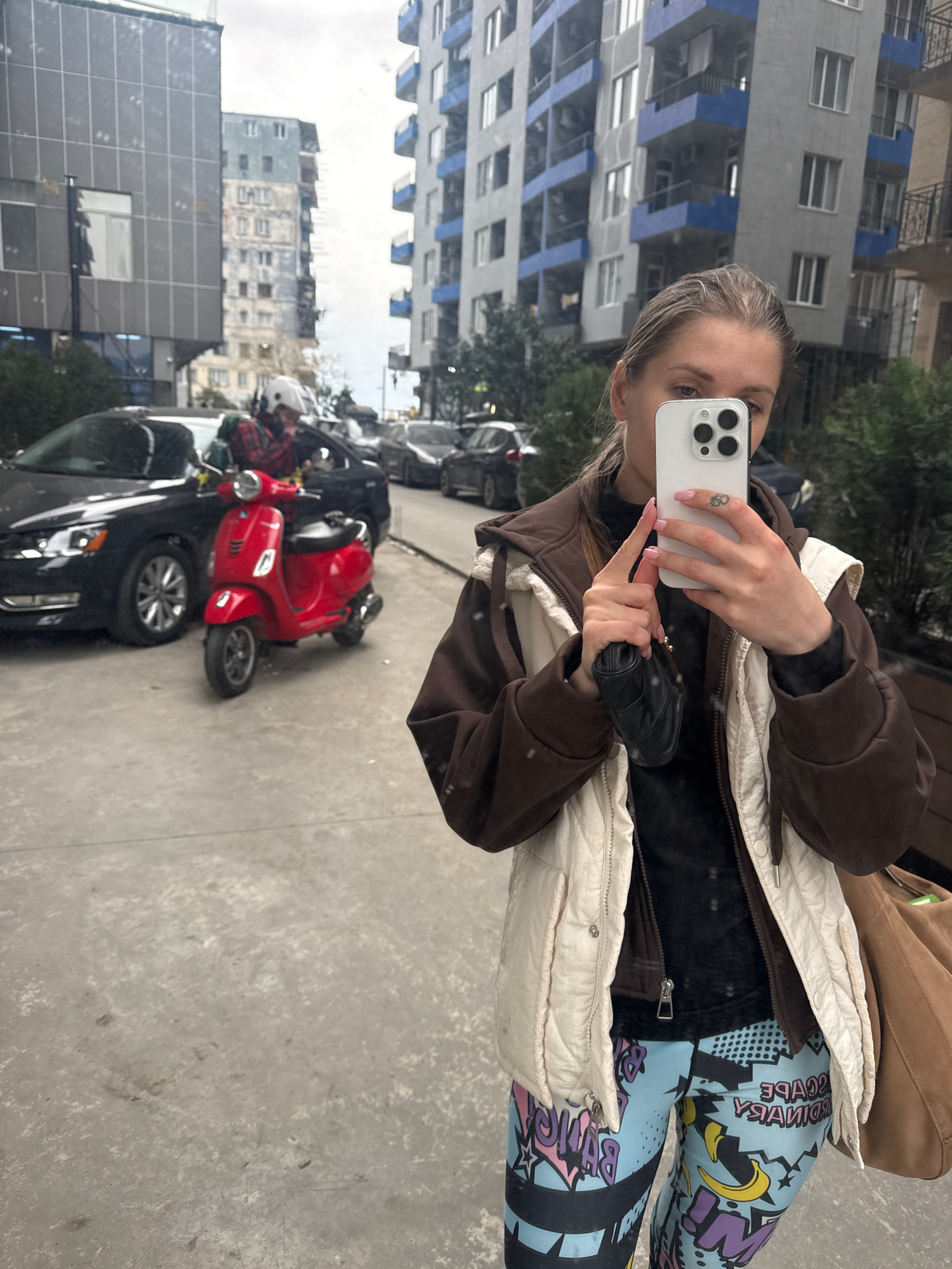 A young woman is taking a selfie using a white smartphone. She is wearing a brown and white jacket and colorful leggings. She is holding a small black purse. The photo appears to be taken in a mirror.…read more