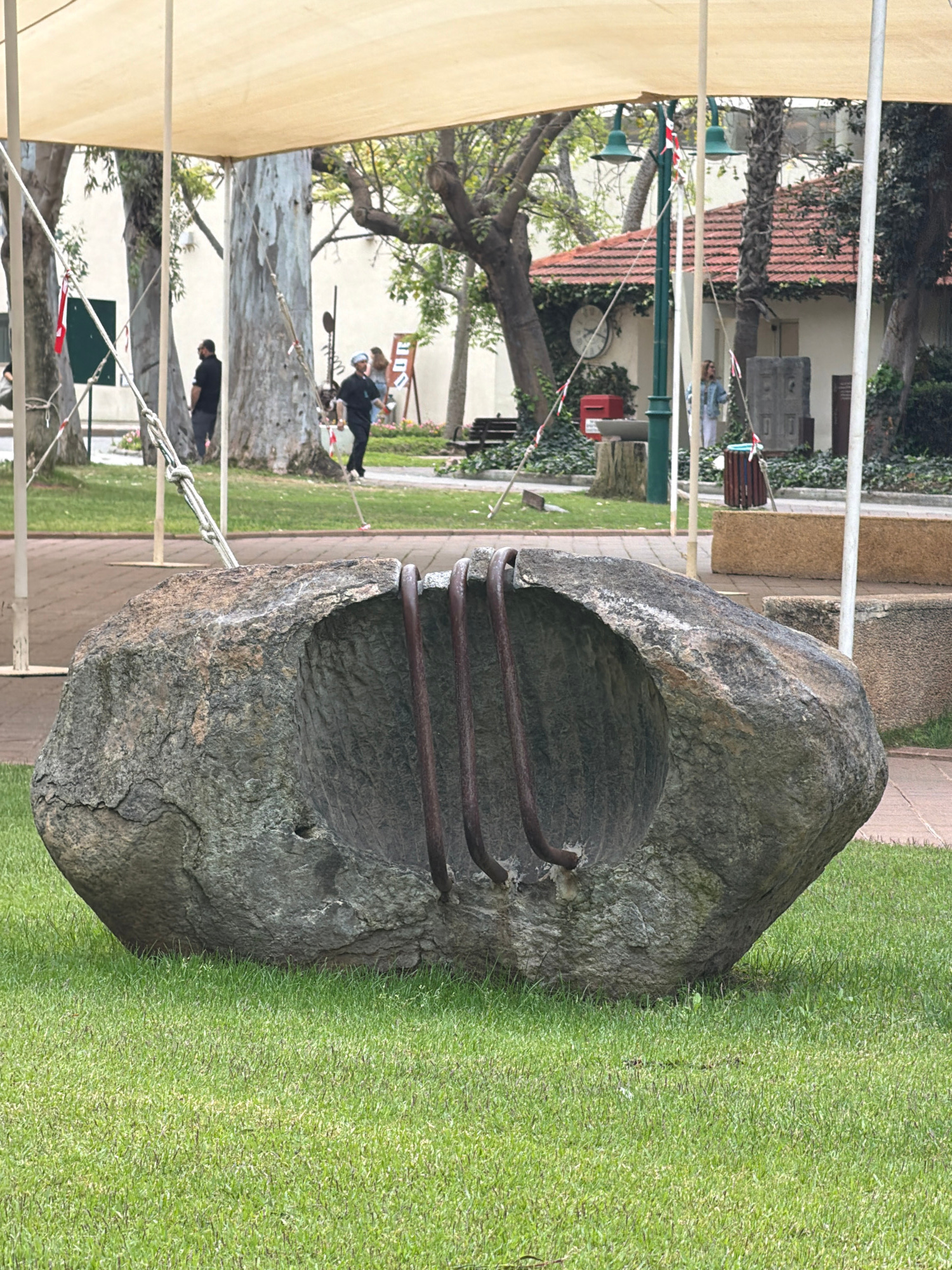 The photograph depicts a stone sculpture with embedded metal bars, located in Herzliya, Israel. The sculpture sits on a grassy lawn, adjacent to a paved walkway. A partially visible canopy supported b…read more