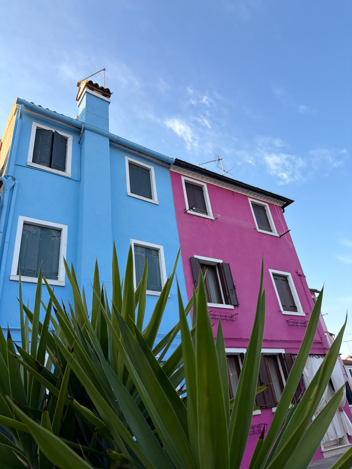 Two residential buildings in Burano, Venice, Italy, are depicted from a low-angle perspective under a blue sky with scattered white cirrus clouds. The building on the left is painted light blue, featu…read more