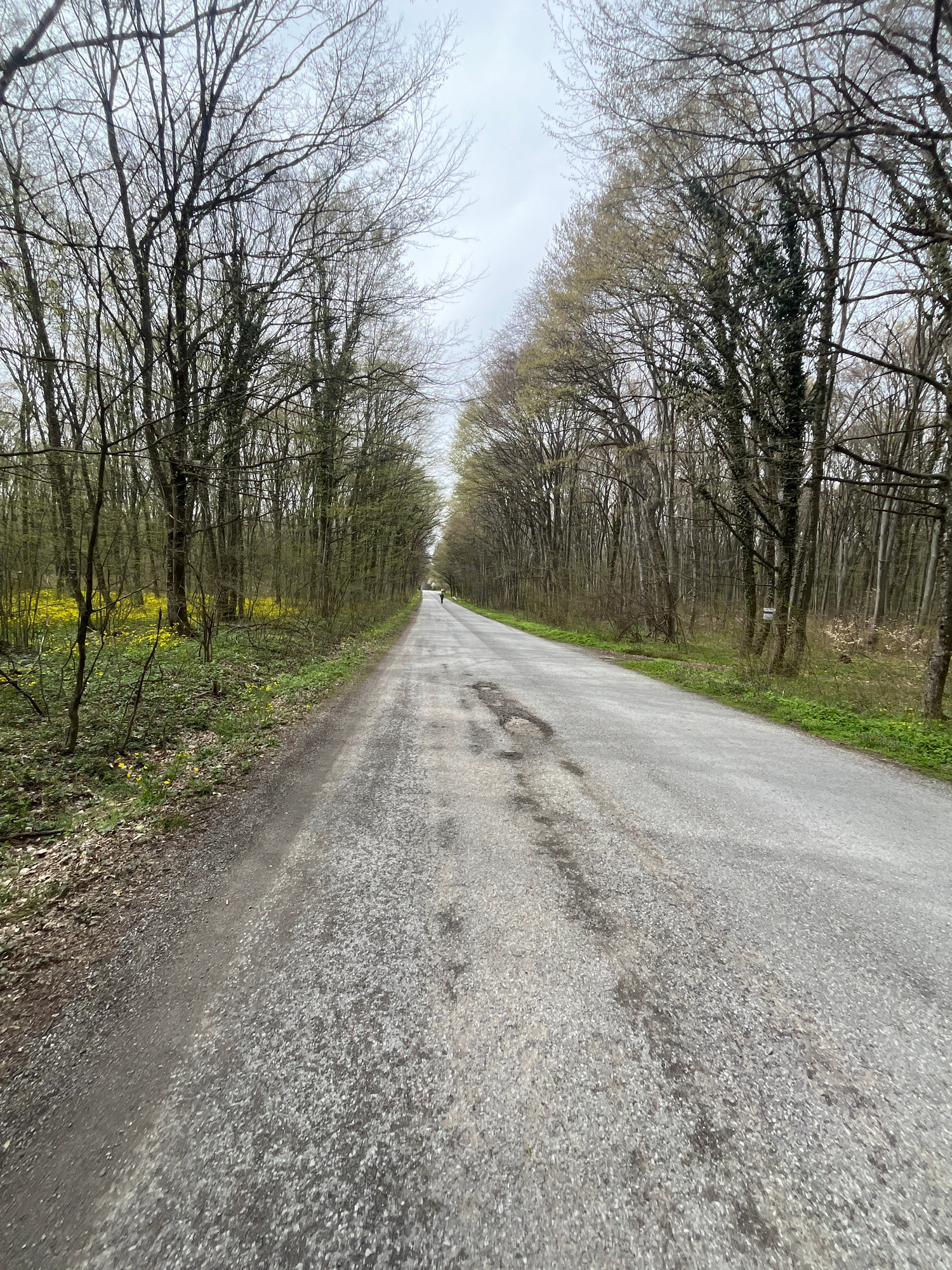 The image shows a narrow, gray asphalt road stretching into the distance. The road surface appears slightly wet and marked with dark patches. On either side of the road are dense rows of bare trees, t…read more
