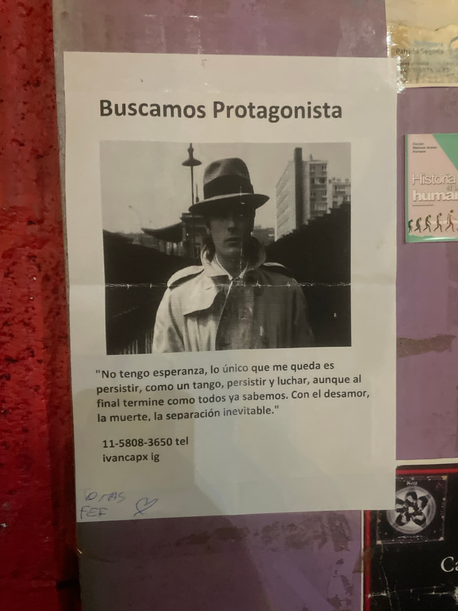 The image shows a flyer posted on a surface. The flyer reads "Buscamos Protagonista" (We are looking for Protagonist) and features a black and white image of a person wearing a hat. Below the image is…read more