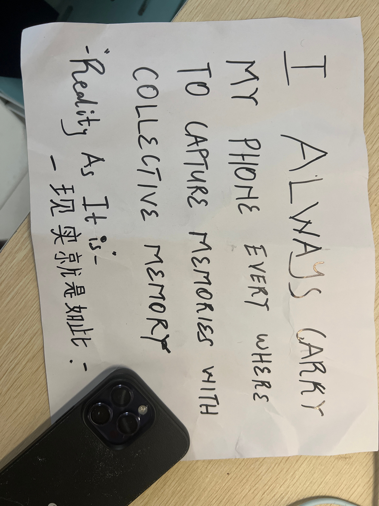 The image features a handwritten note and a smartphone resting on a light-colored wooden desk, likely indoors. The white paper note, slightly creased, bears a message in black marker in English and Ch…read more