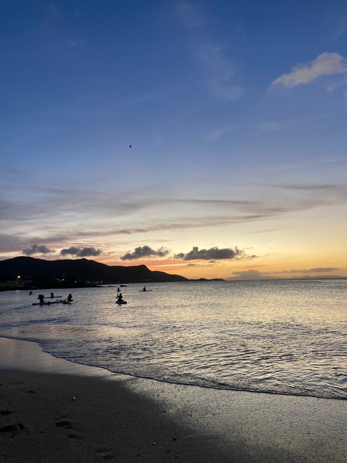 A scenic view features a beach at sunset. The sky displays a gradient of blues and oranges with wispy clouds. The sea reflects the sunset's colors, rippling gently towards the dark sandy beach. Silhou…read more