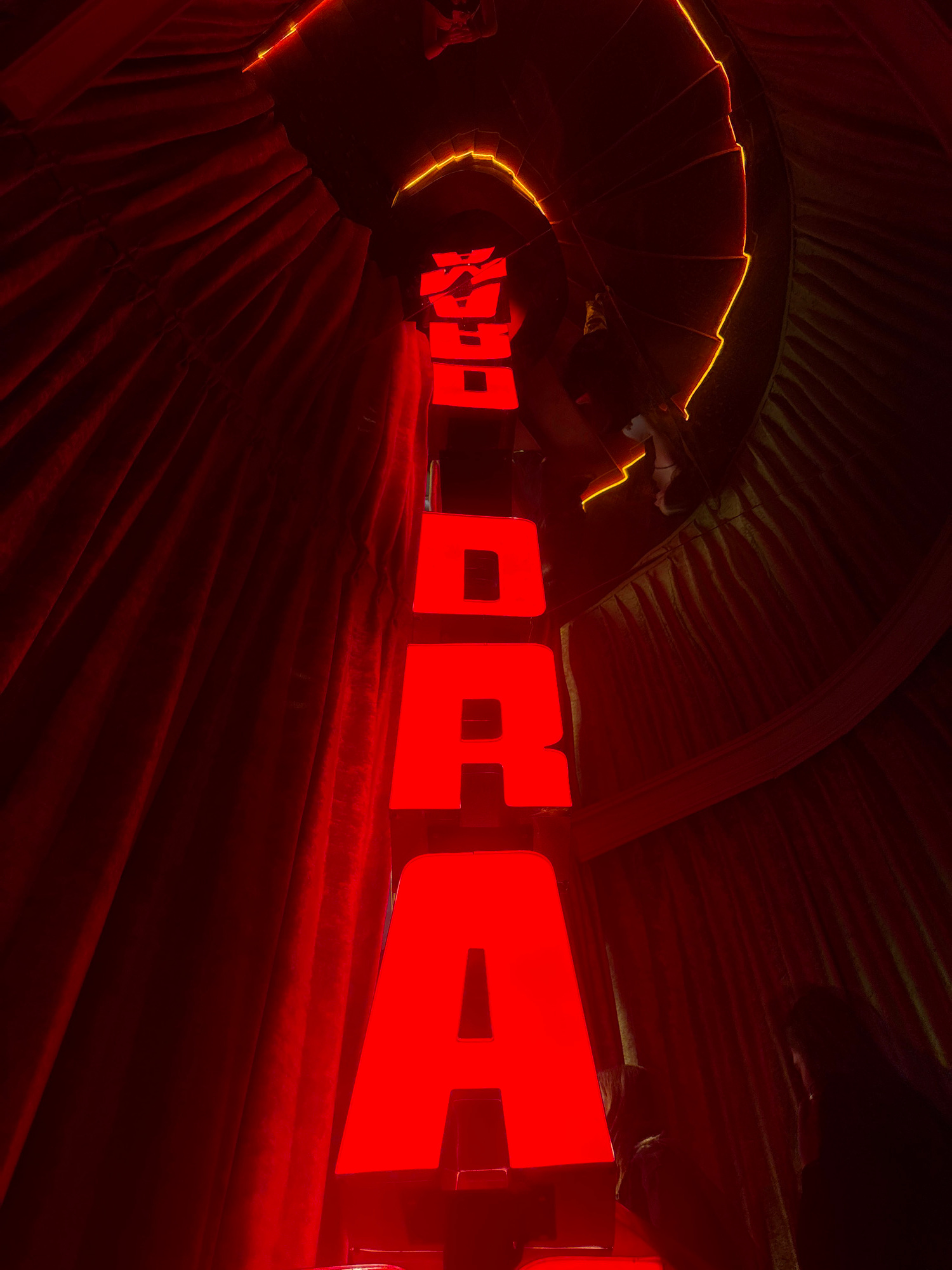 The image depicts a red-lit, tunnel-like installation with large, red letters spelling out a word. The tunnel is lined with textured material, possibly fabric or corrugated metal, with yellow neon lig…read more