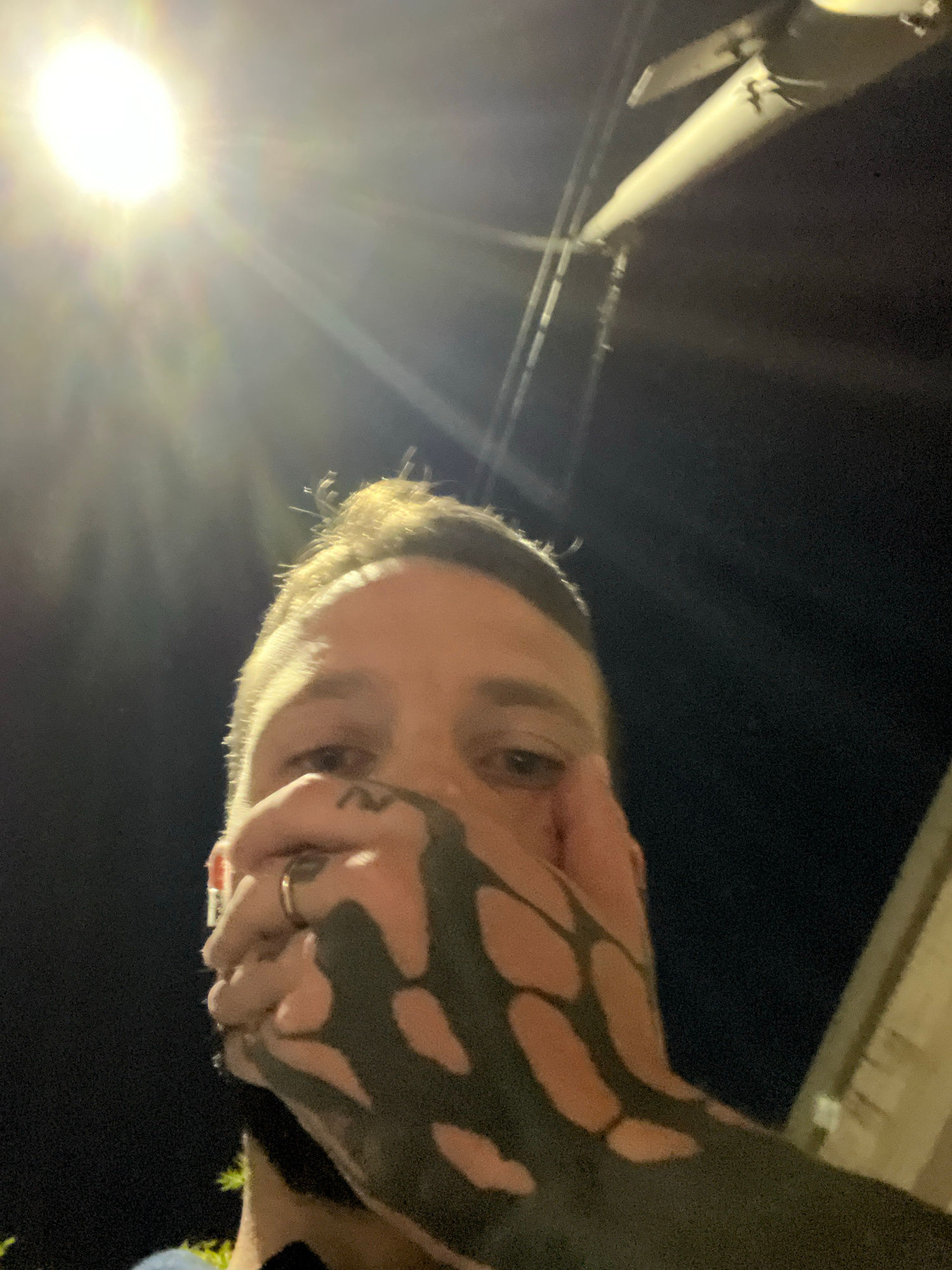 A nighttime, low-angle selfie featuring a person's face and hand. The person has fair skin, light-colored hair, and visible facial features, including eyes and a nose ring. The person's hand, position…read more