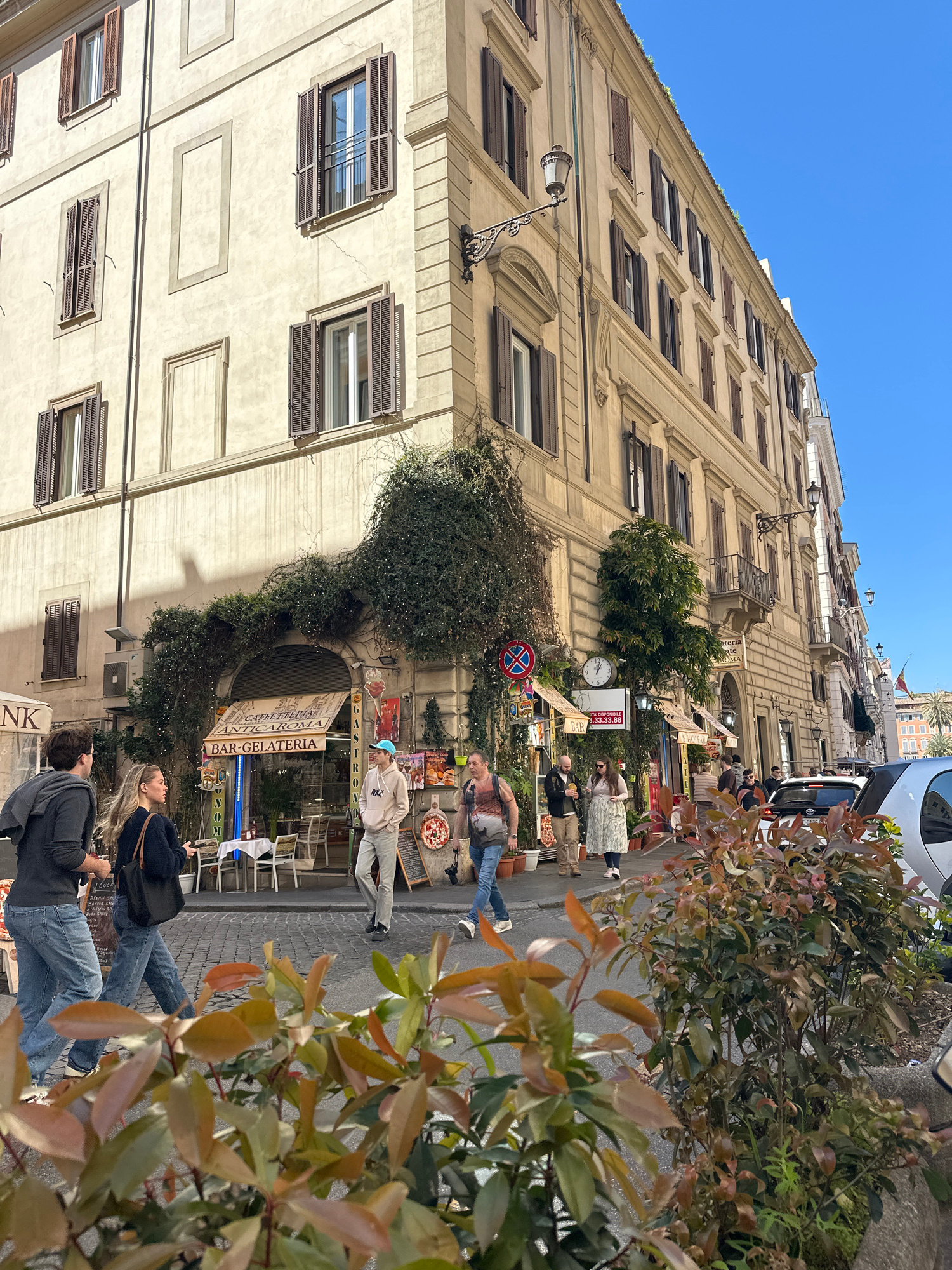 This image depicts a sunlit street scene in Rome, Italy, specifically at the corner of Via dei Pastini. The prominent structure is a multi-story, light-beige stucco building with ornate architectural…read more