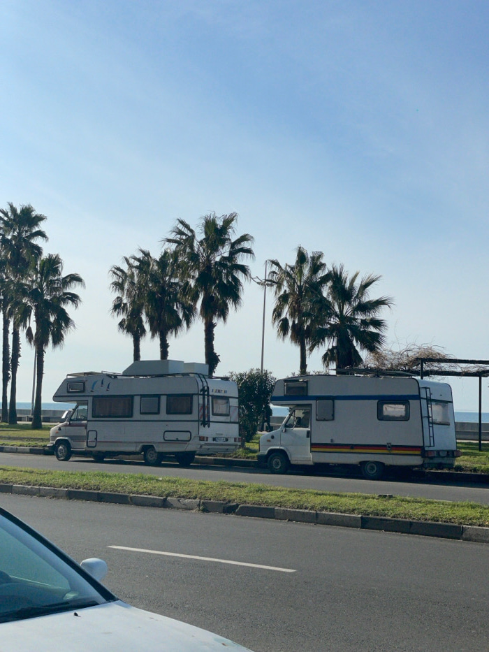 The image displays a daytime scene along the coastal area of Batumi, Georgia, likely Batumi Boulevard. In the midground, two white camper vans (motorhomes) are parked on a grassy verge adjacent to a p…read more