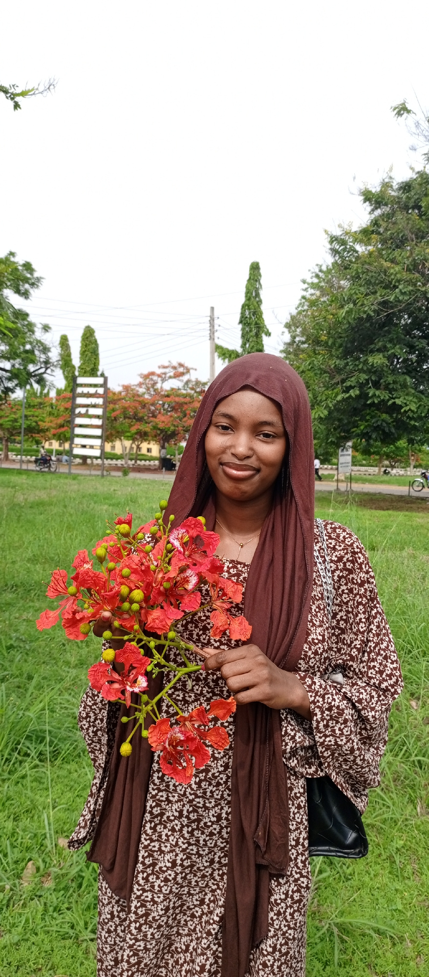 A young woman stands in a grassy field, holding a bouquet of bright red flowers with some green buds. She is wearing a patterned brown and white dress with a brown headscarf. A black purse hangs from…read more