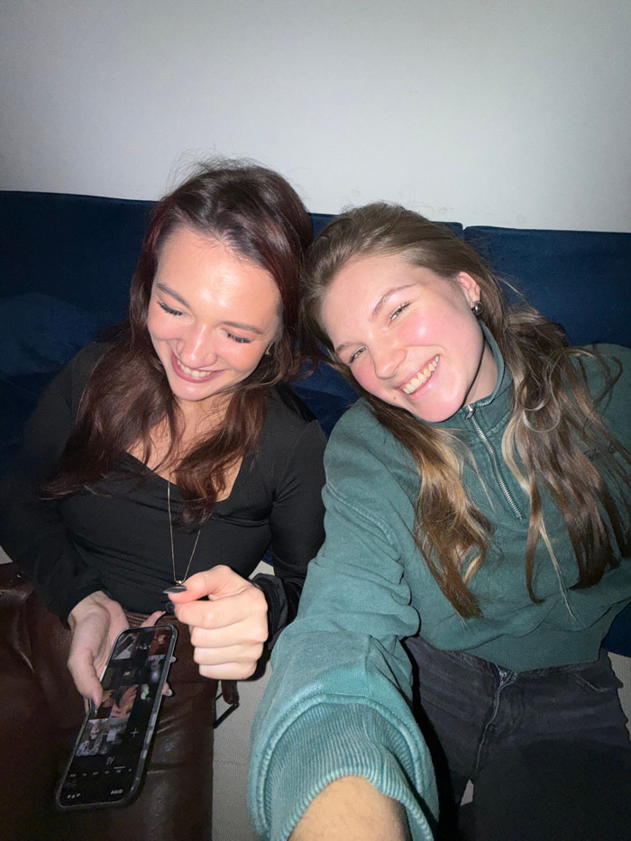 Two smiling women lie side-by-side on a couch. One woman with blonde hair wears a green sweatshirt and jeans. The other woman with reddish-brown hair wears a black top and holds a phone displaying a c…read more