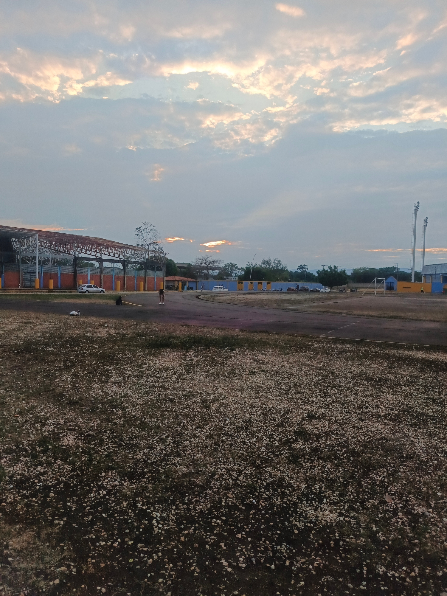 The image depicts an outdoor sports complex at dusk. The location is in Tinaquillo, Venezuela. In the foreground is a field of low-lying ground cover or sparse grass dotted with small, light-colored s…read more