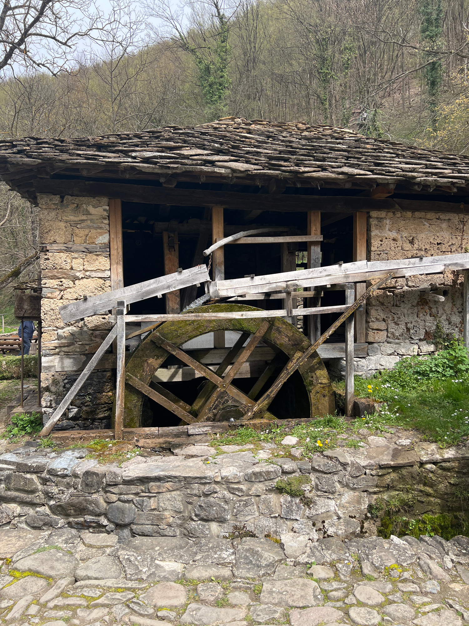 The image shows a watermill in the Etar Architectural-Ethnographic Complex in Gabrovo, Bulgaria. The mill is constructed of stone and wood, featuring a large water wheel partially obscured by wooden s…read more