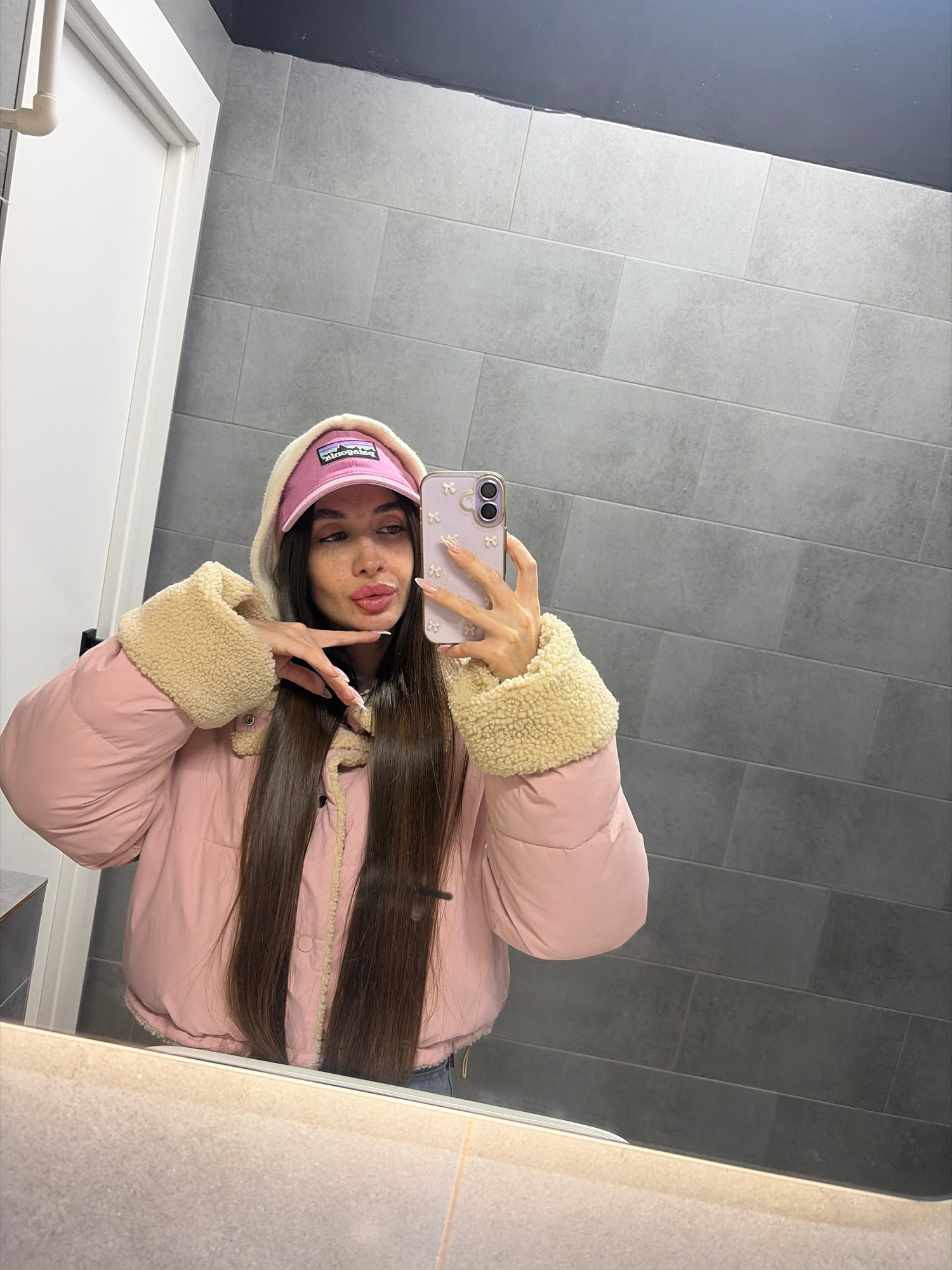 A woman is taking a selfie in what appears to be a bathroom. She is wearing a pink puffer jacket with a beige fur-lined collar and cuffs, and a pink baseball cap with a logo. She is holding a lavender…read more