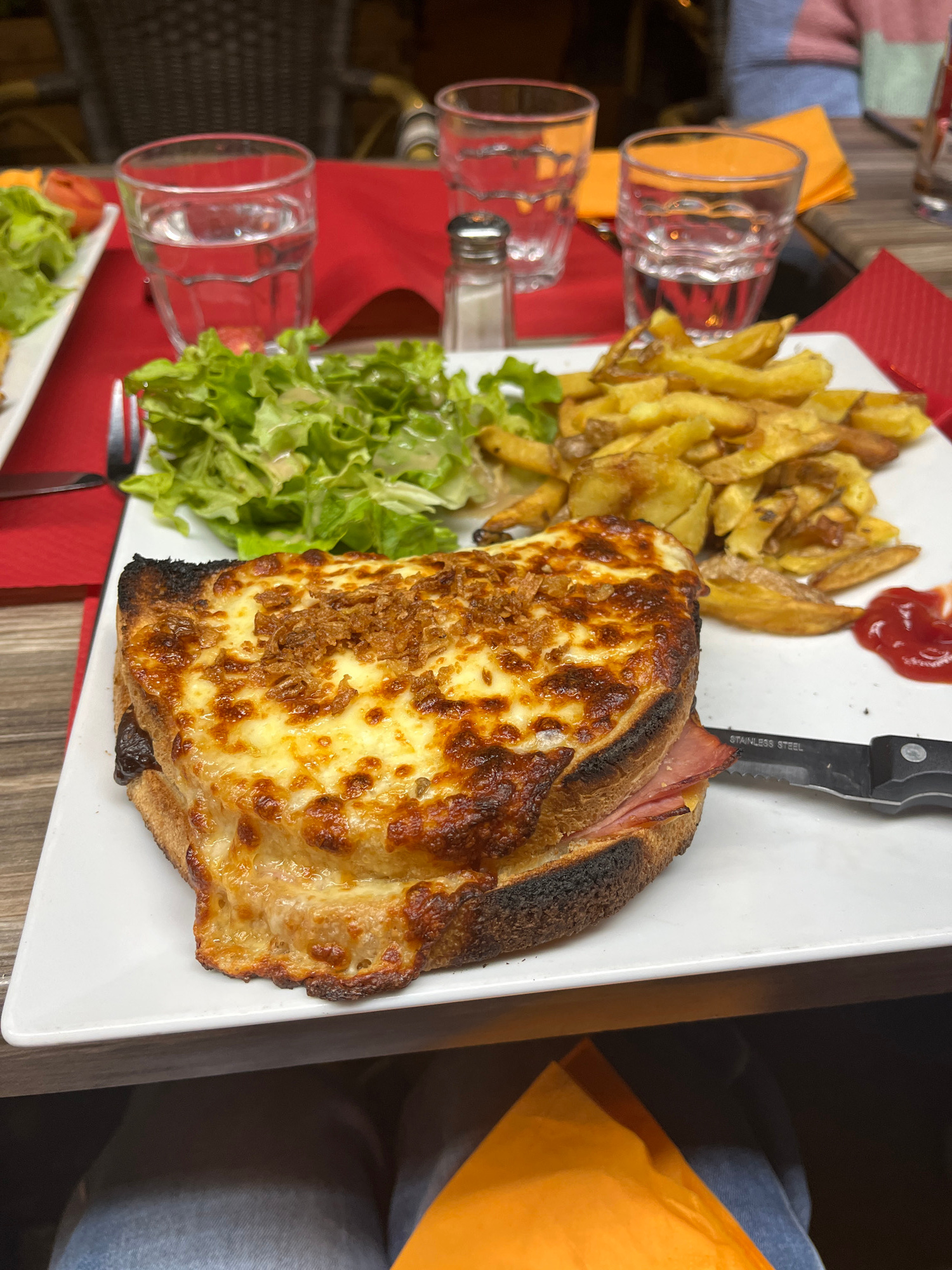 A close-up, medium-angle shot displays a meal on a white, rectangular plate. The meal consists of a croque monsieur, golden-brown potato wedges, a small portion of green salad, and a dollop of ketchup…read more