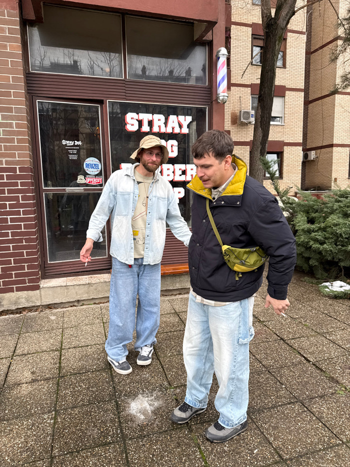Two adult males are shown standing outdoors on a paved sidewalk in front of the "STRAY DOG BARBER SHOP" at Džona Kenedija 32, Belgrade, Serbia. The barber shop's entrance features large windows with s…read more