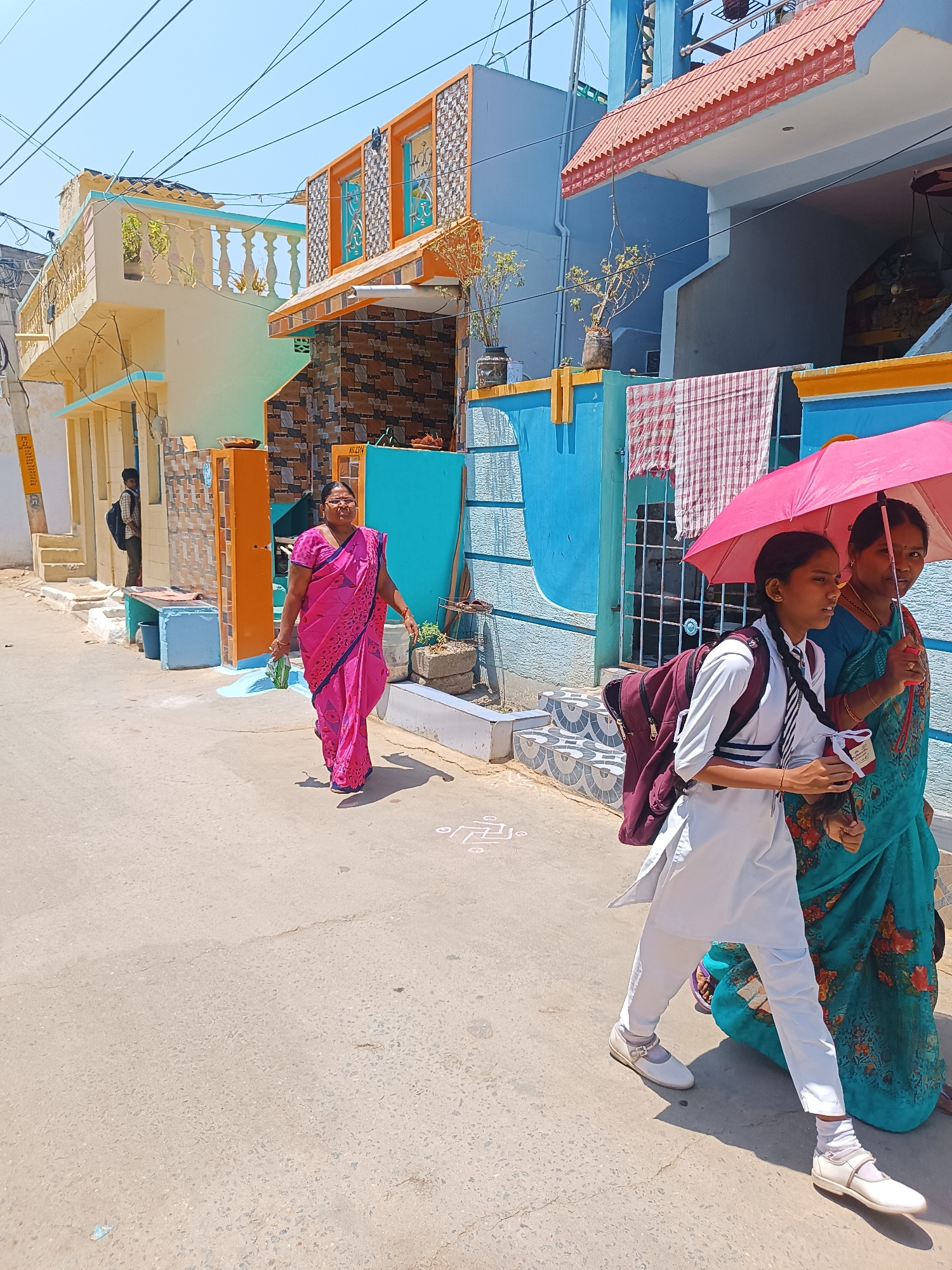 A daytime street scene in Pedda Kammavaripalli, India, features pedestrians on a paved thoroughfare bordered by residential buildings. In the foreground-right, a young female, identified as a student…read more