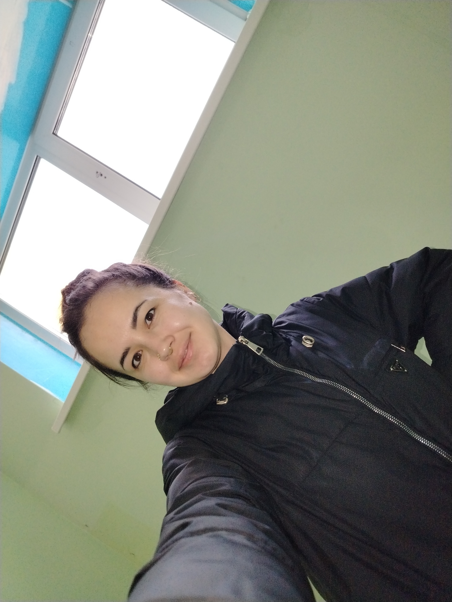 A woman is taking a selfie in what appears to be an interior space. She is wearing a black jacket with a zipper. The background consists of a light green wall and a window frame, with the window showiβ¦read more