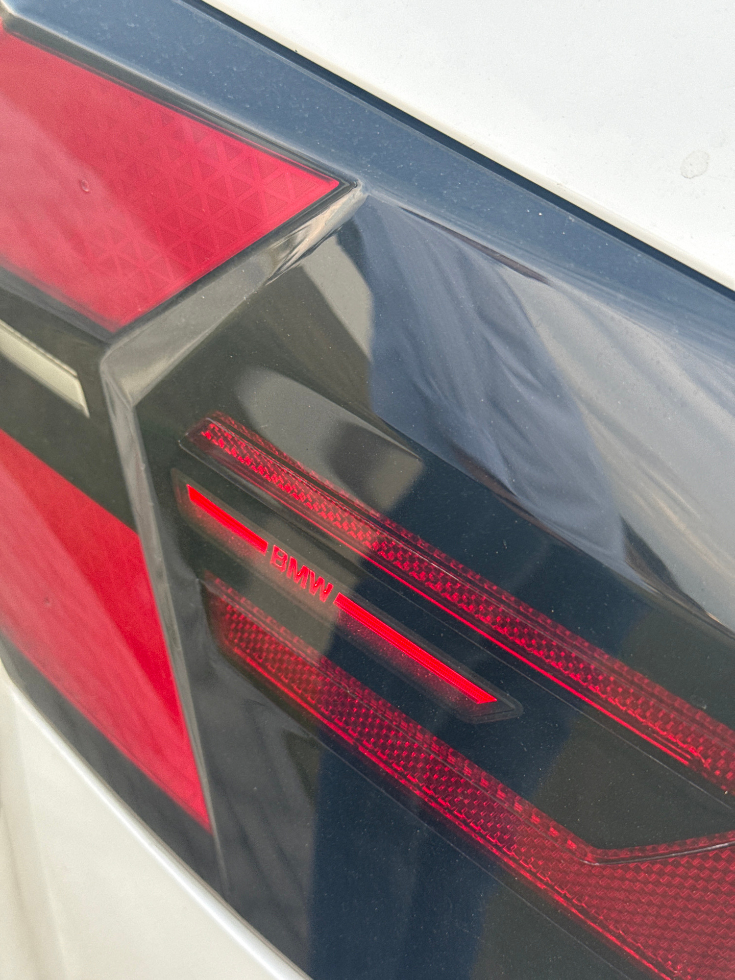 The image shows a close-up of a BMW tail light. The light is red and black, with a small "BMW" label. The vehicle appears to be white. The scene does not provide information about the location or envi…read more