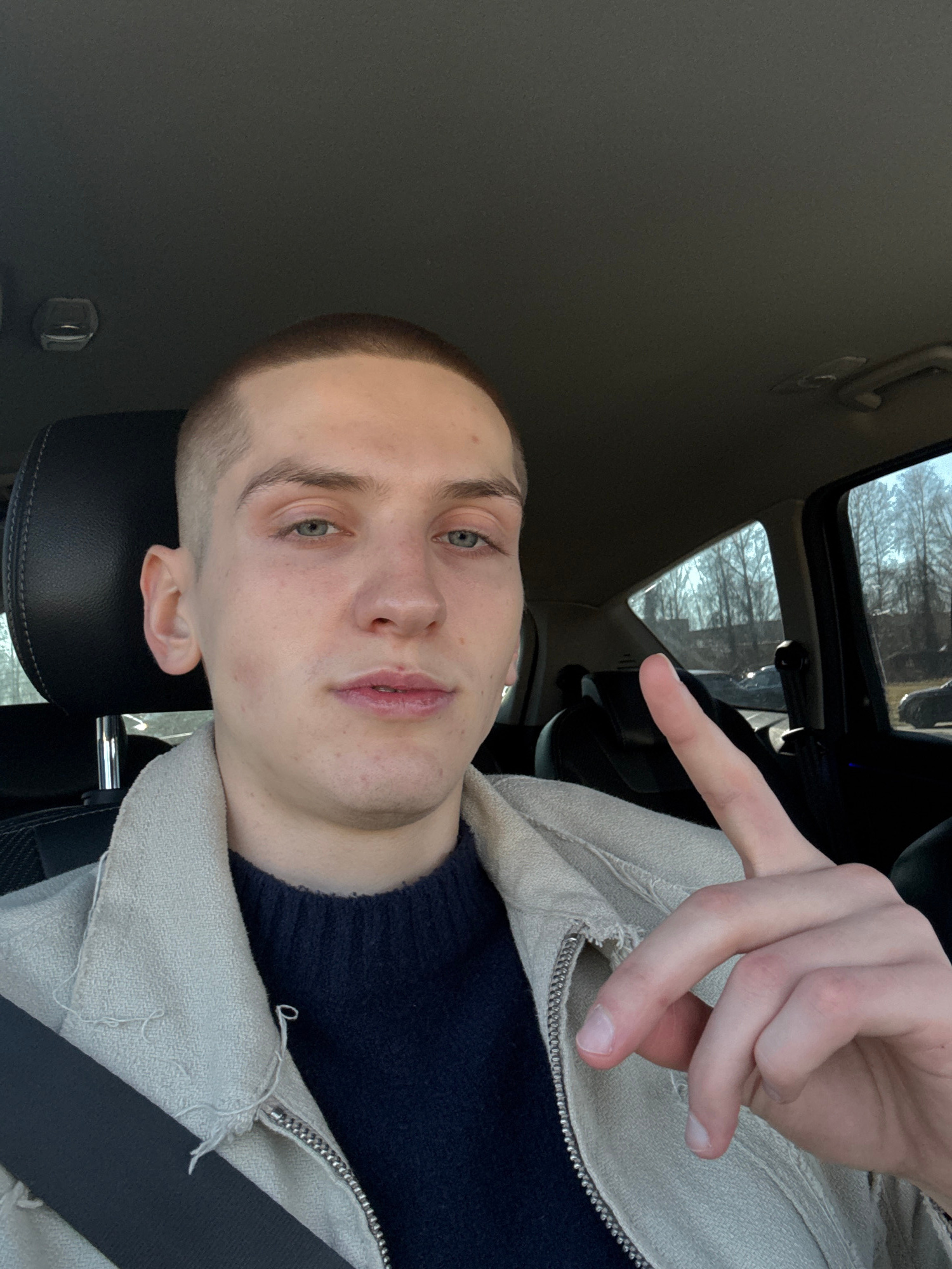 A young man is sitting in a car. He is wearing a dark blue sweater and a light beige jacket. He is making a peace sign with his fingers. The car has a sunroof through which trees are visible. The back…read more