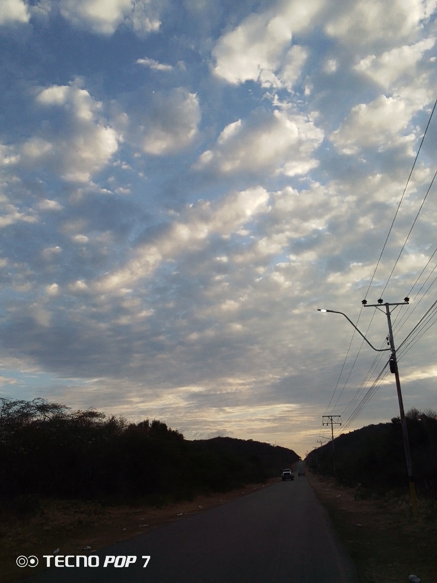 The image depicts a road leading into the distance, flanked by dark vegetation on both sides. Above, a sky filled with clouds is visible, with hints of sunlight breaking through. Utility poles and pow…read more
