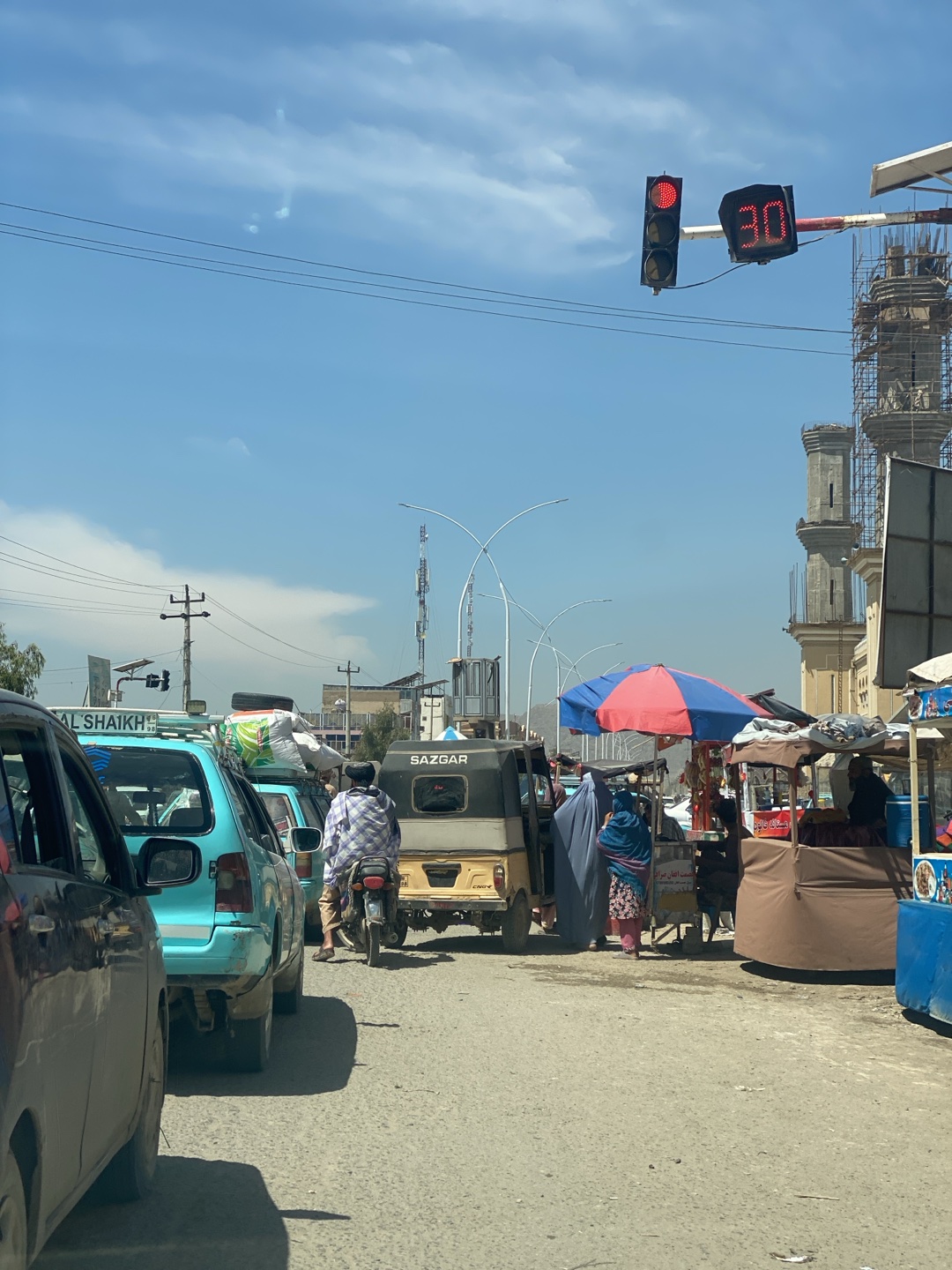 The image depicts a street scene in Kandahar, Afghanistan. The foreground shows congested traffic with several cars and a motorcycle waiting at a traffic light. The traffic light is red with a digital…read more