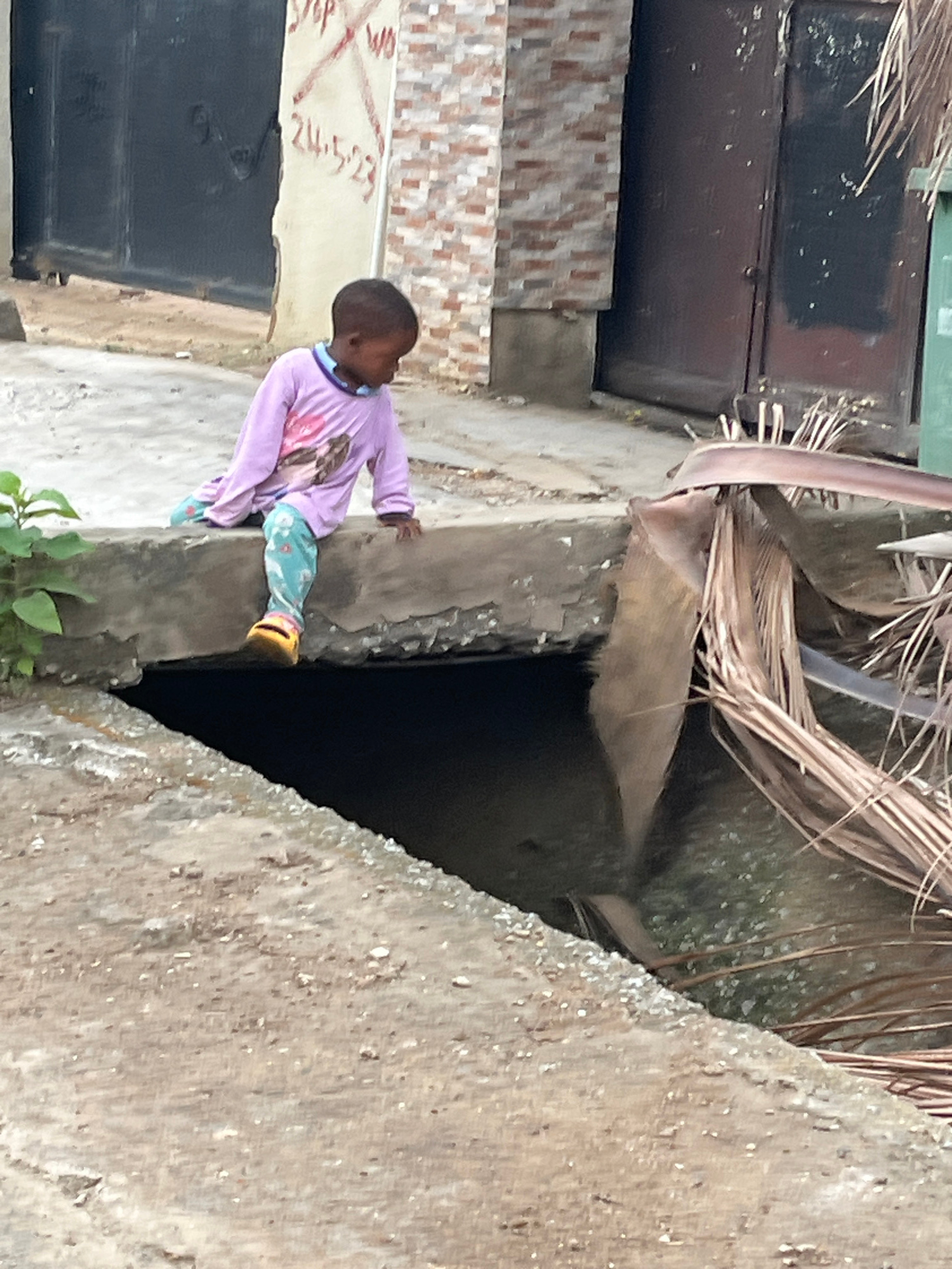 A young child wearing a lavender long-sleeved shirt and patterned blue pants is sitting on the edge of a concrete structure. The child appears to be looking downwards into a dark opening. The surround…read more