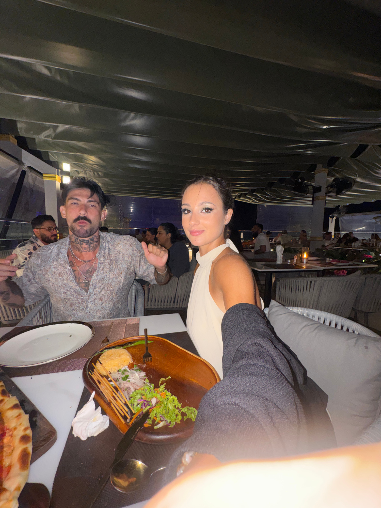 This image captures a nighttime scene at what appears to be a restaurant or lounge, possibly in Patong, Thailand, given the provided context. **Subjects:** In the foreground, a woman with dark hair t…read more