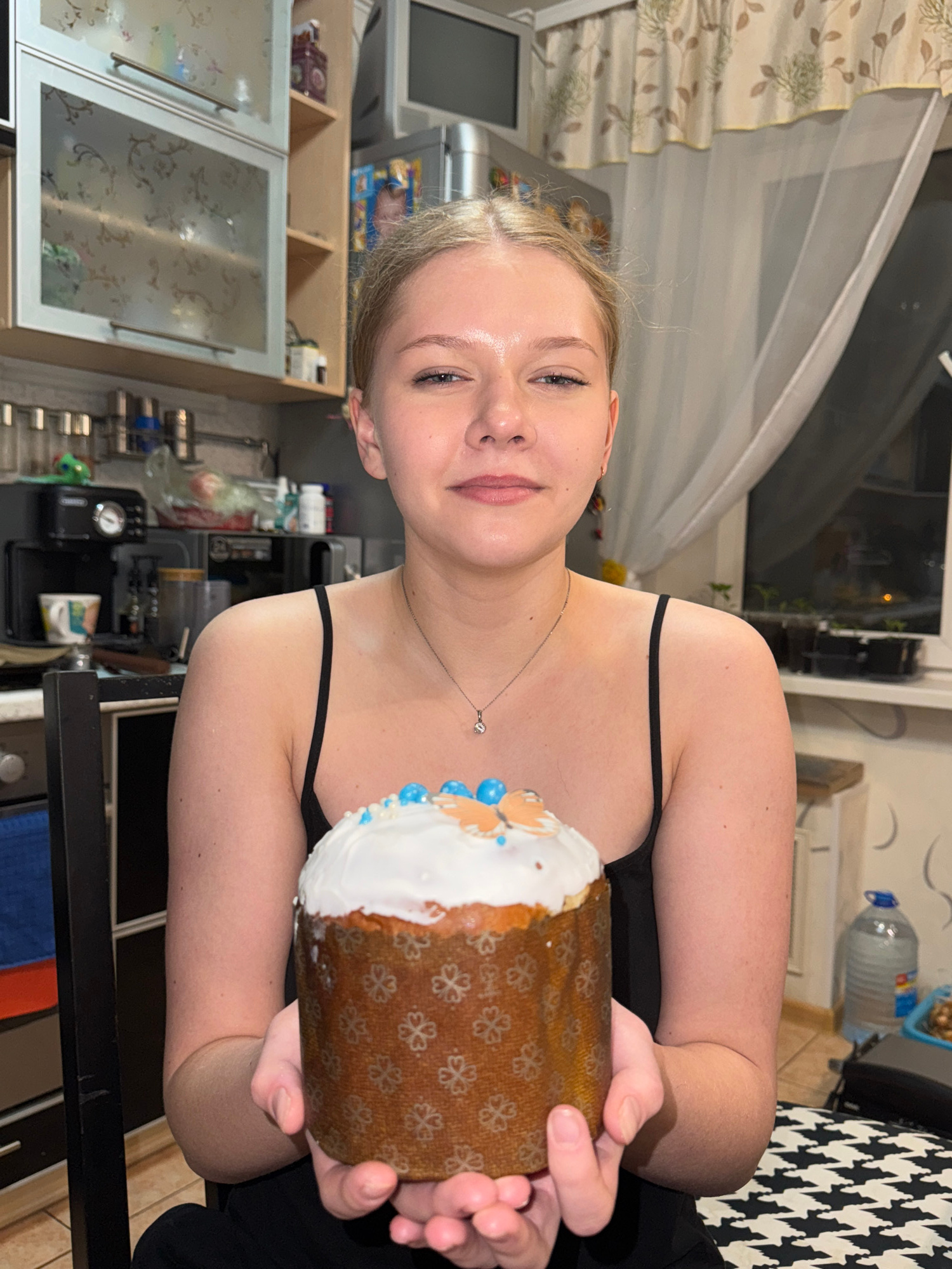 A young woman with fair skin and blonde hair holds a decorated Easter cake in her hands. The cake is cylindrical, brown with a flower pattern, and topped with white icing and blue sprinkles. She is we…read more