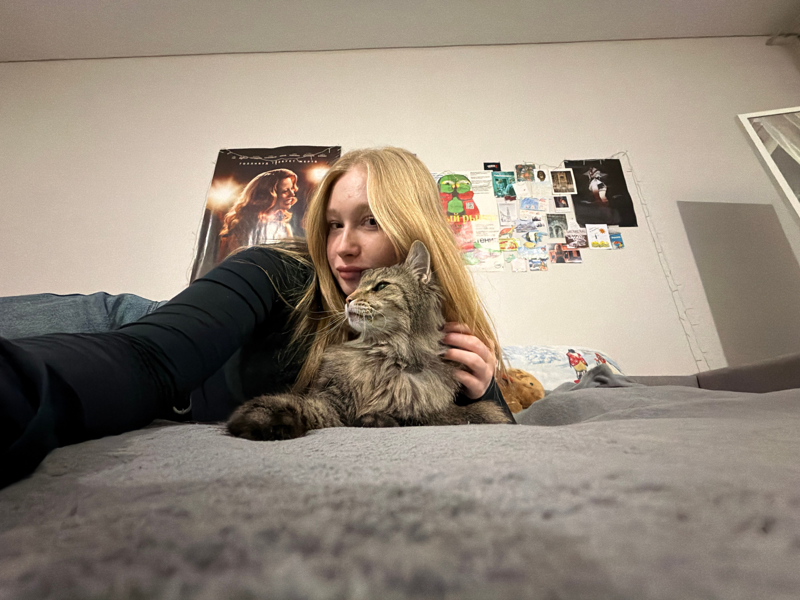A woman with blonde hair is lying on her back on a bed with a gray comforter, holding a gray tabby cat in her arms. The cat is positioned near her face. Behind her head is a white wall adorned with po…read more