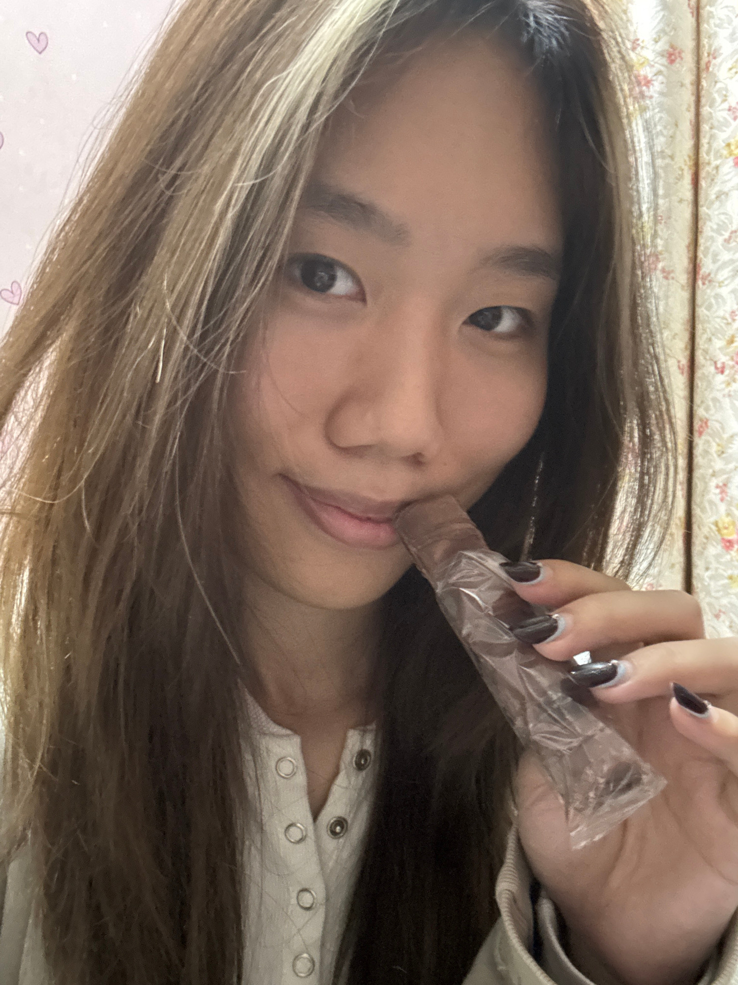 A young woman is holding a sealed, slender, brown object to her lips. Her dark hair is blonde toward the ends and falls over her left shoulder. She is wearing a white button-up shirt and has long, dar…read more