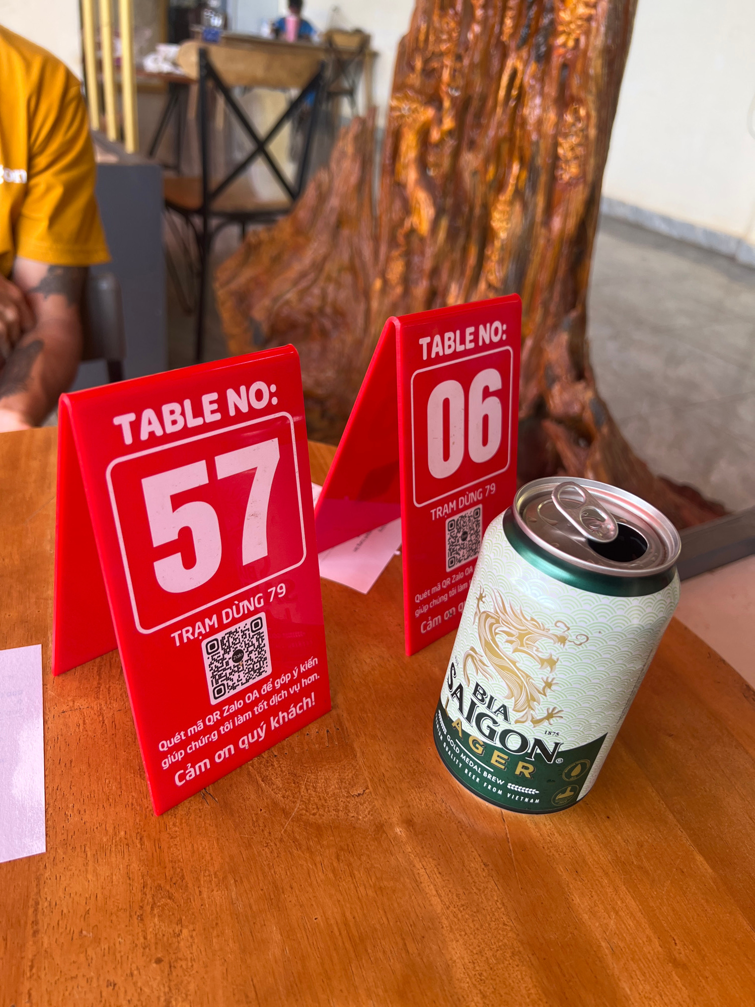 The image shows a table in what appears to be a restaurant or bar, evidenced by table numbers and a can of beer. The table is made of wood, likely in a warm, earthy tone, and has two red table number…read more
