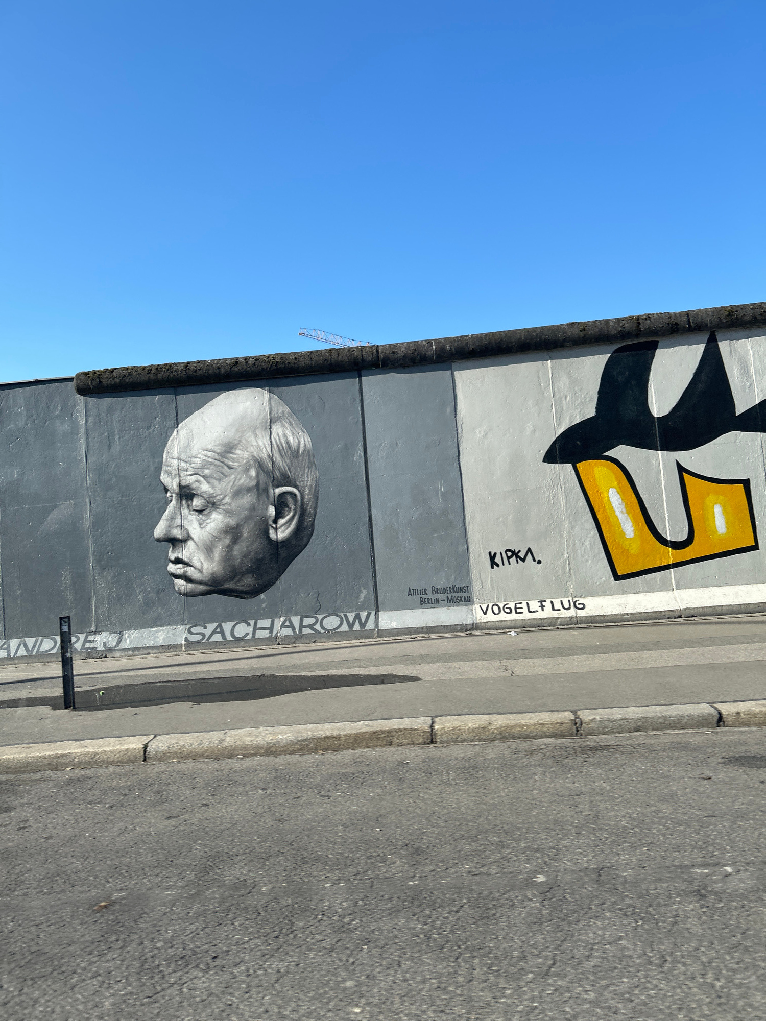 The image displays a section of the Berlin Wall, adorned with murals under a clear, bright blue sky. The scene is oriented vertically, showing the wall on the left and a road on the right. A prominen…read more