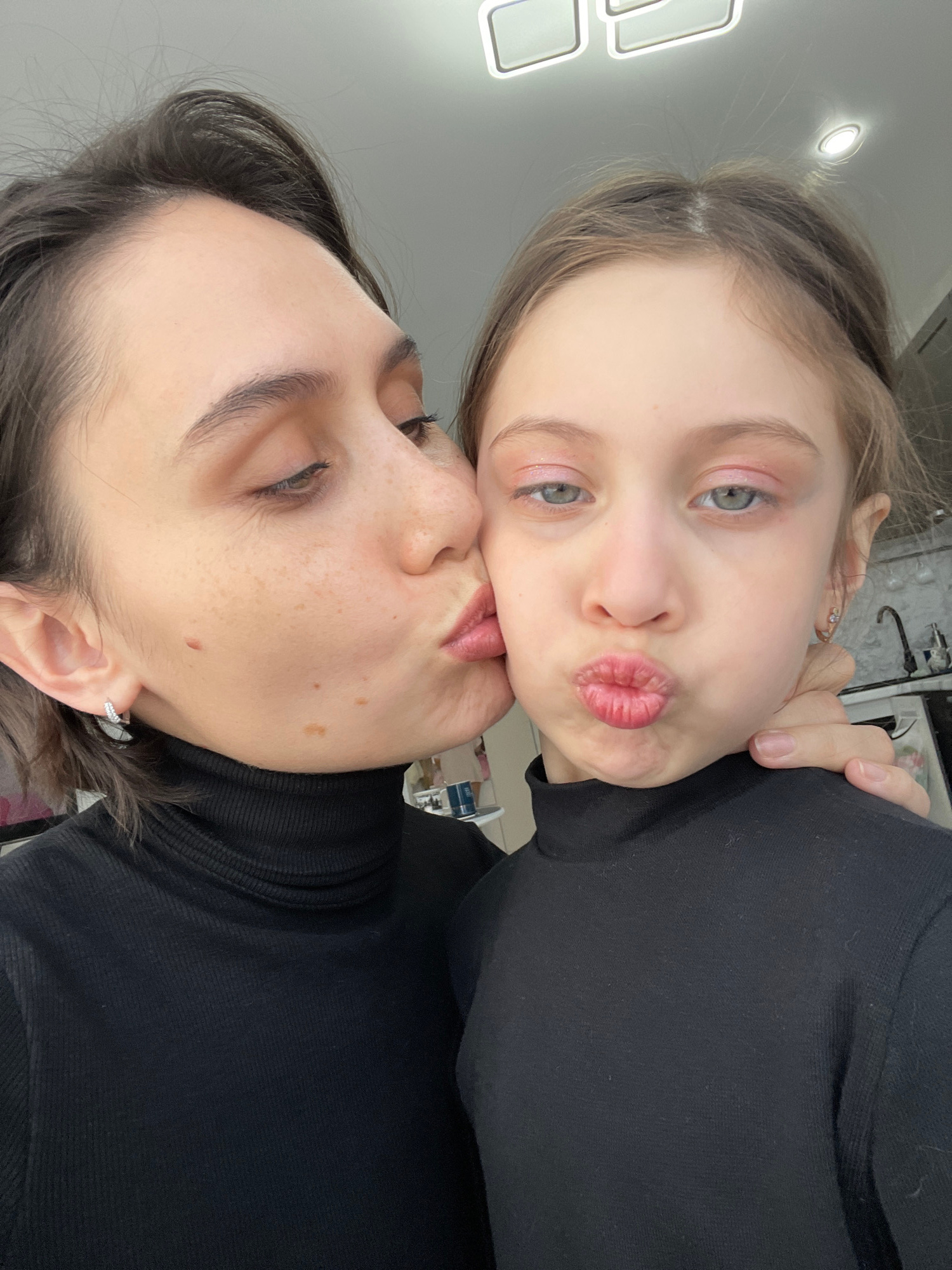 A close-up shot captures two individuals, likely a mother and daughter, in an affectionate pose. The daughter, positioned above, puckers her lips towards the mother's face. Both are wearing black turt…read more