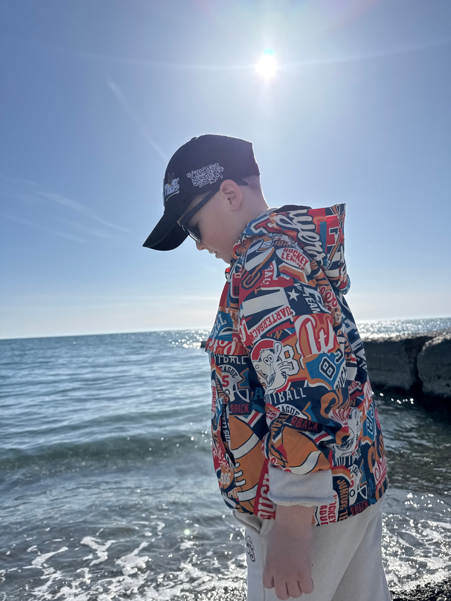 A person is depicted outdoors in a side profile, standing by a body of water, likely the Black Sea in Sochi, Russia. The bright midday sun is visible in the upper left, casting a strong flare and illu…read more
