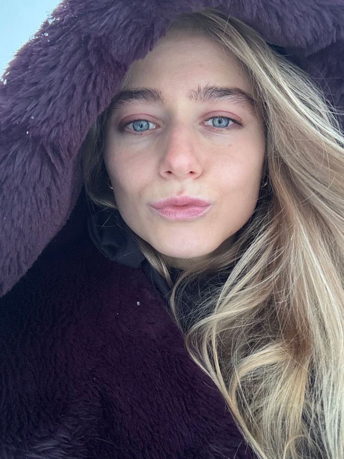 A close-up, head-and-shoulders portrait depicts a young adult female with fair skin, blue eyes, and long, wavy blonde hair. She is looking directly at the camera with a slight pout. She is wearing a d…read more