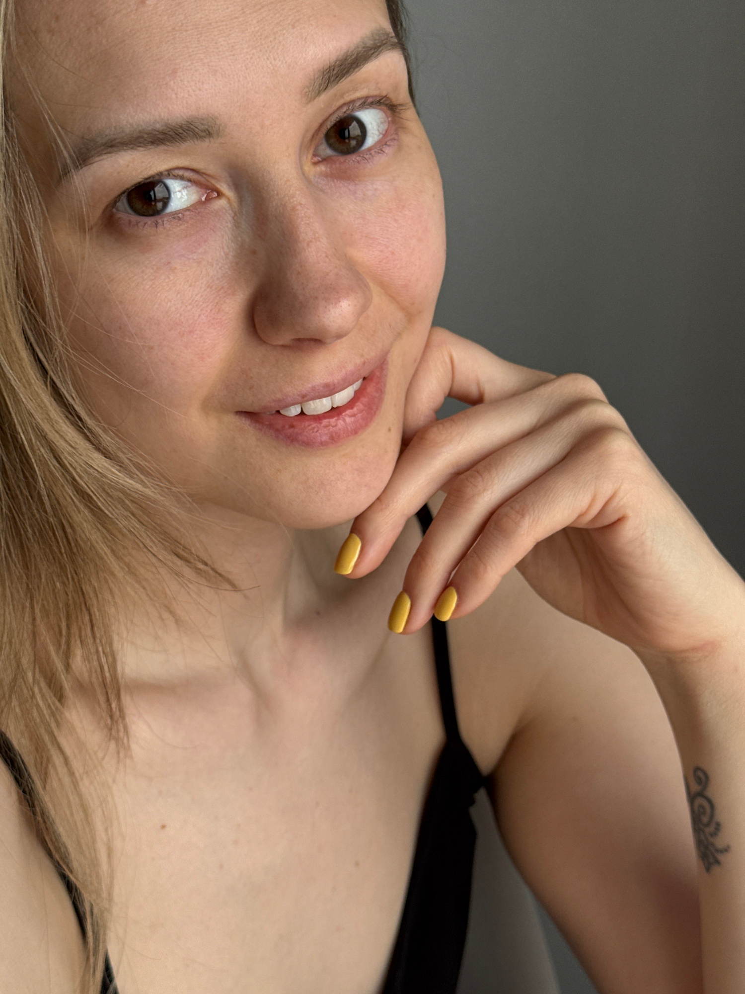 A close-up, tilted portrait shows a woman with fair skin and light brown hair partially obscuring her chest. She is lying down, looking at the camera with brown eyes and smiling slightly, revealing white teeth. Her right hand is raised, with her fingers near her cheek. Her fingernails are painted a bright yellow. She is wearing a black top with thin straps. A small tattoo is visible on her right forearm. There is no specific information to determine this image was taken in the city of Chaikovsky, Russia. The background is a neutral grey. | Open Wire