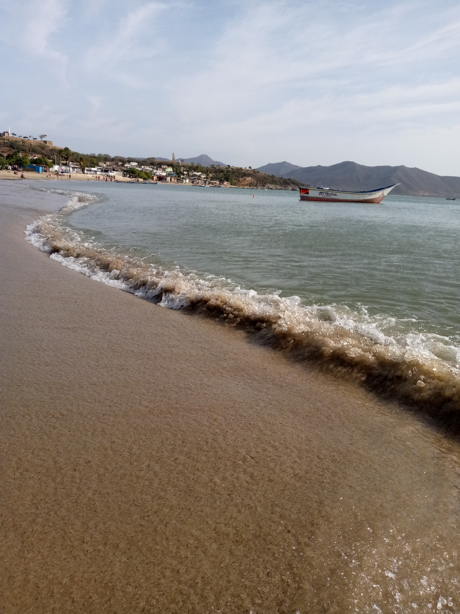 The image captures a coastal scene in Juan Griego, Venezuela. The foreground shows a sandy beach with a wave breaking along the shore. The water appears turbid. In the midground, a white and red boat…read more