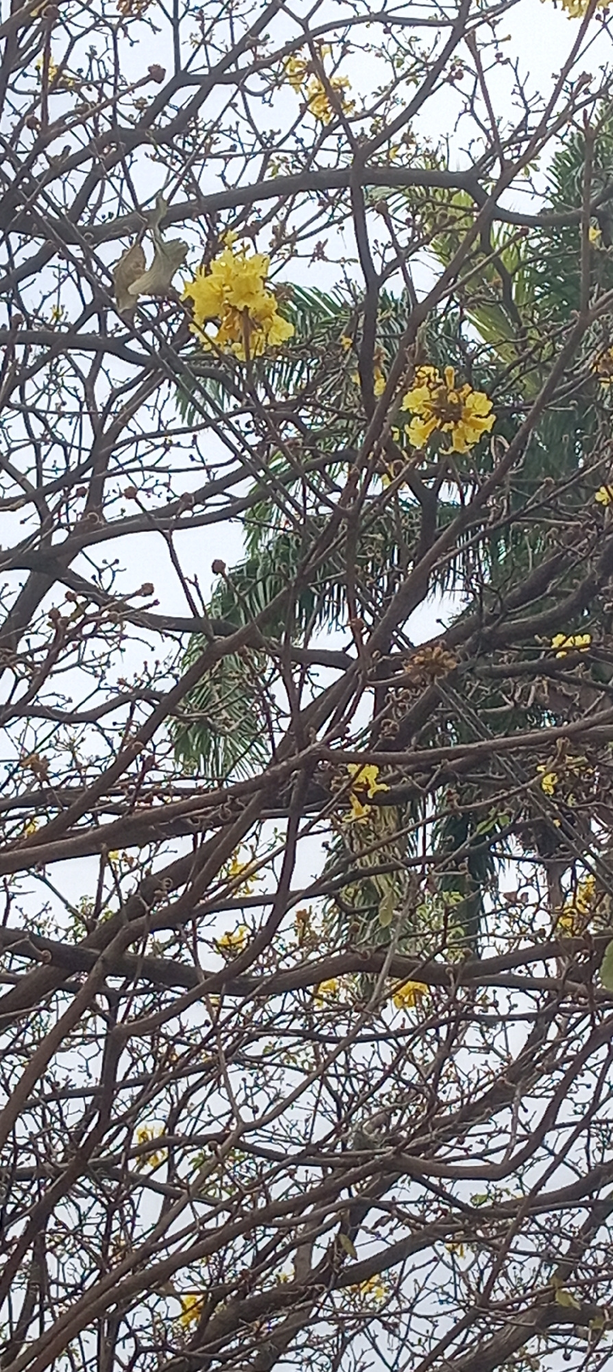 The image captures a tree with bare branches and a scattering of yellow flowers, seemingly in the early stages of bloom. In the background, a palm tree is partially visible. The image location is in T…read more
