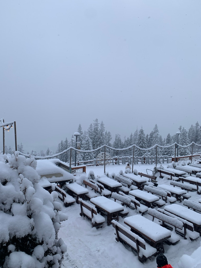 The image displays a heavily snow-covered outdoor seating area located in Zakopane, Poland, under an overcast, light grey sky with visible falling snow. The scene is dominated by numerous rows of empt…read more