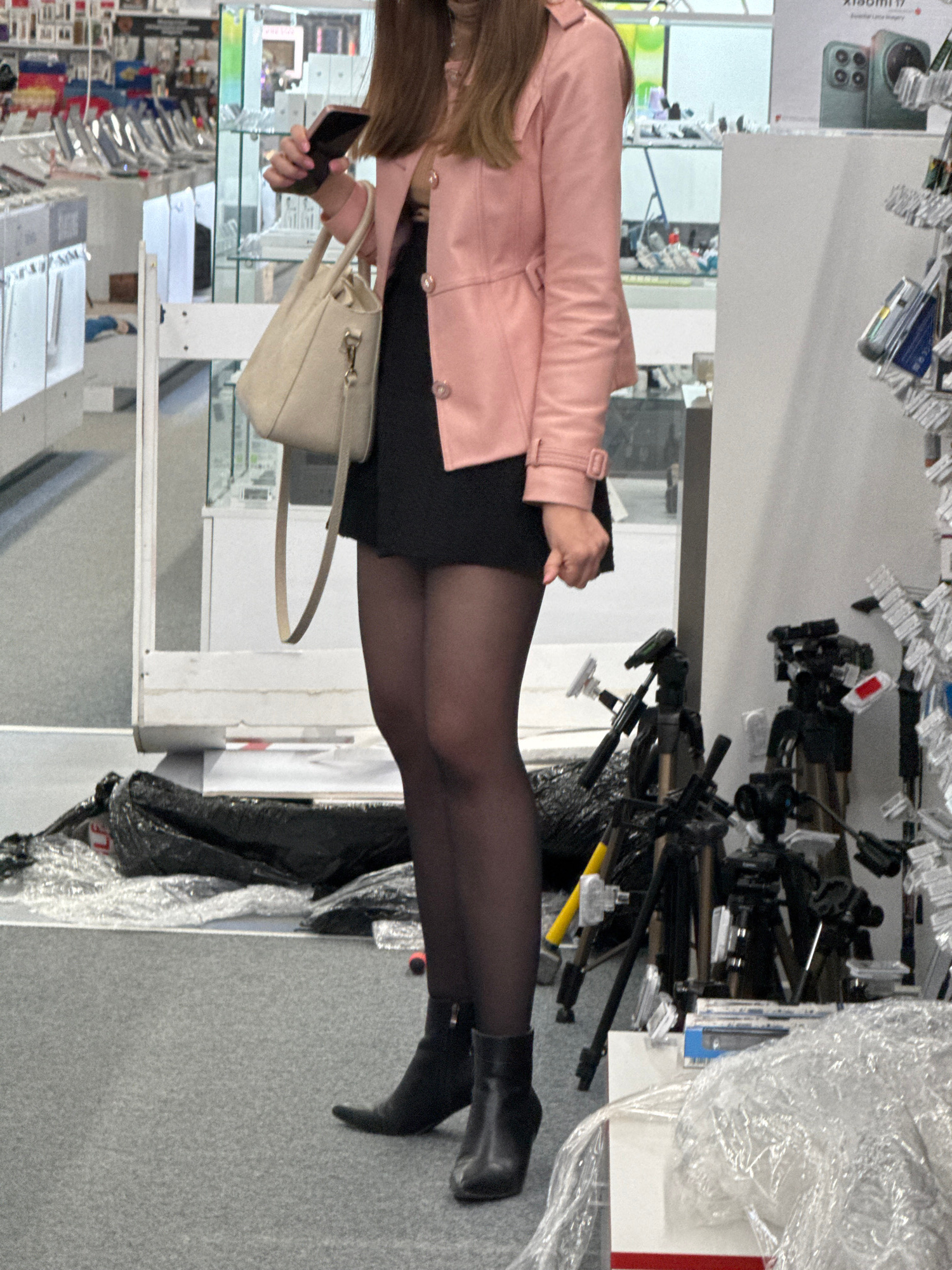 A woman stands in a store aisle. She is wearing a pink jacket, black dress, black tights, and black boots. She is holding a light beige purse and a smartphone. The store aisle contains photography equ…read more