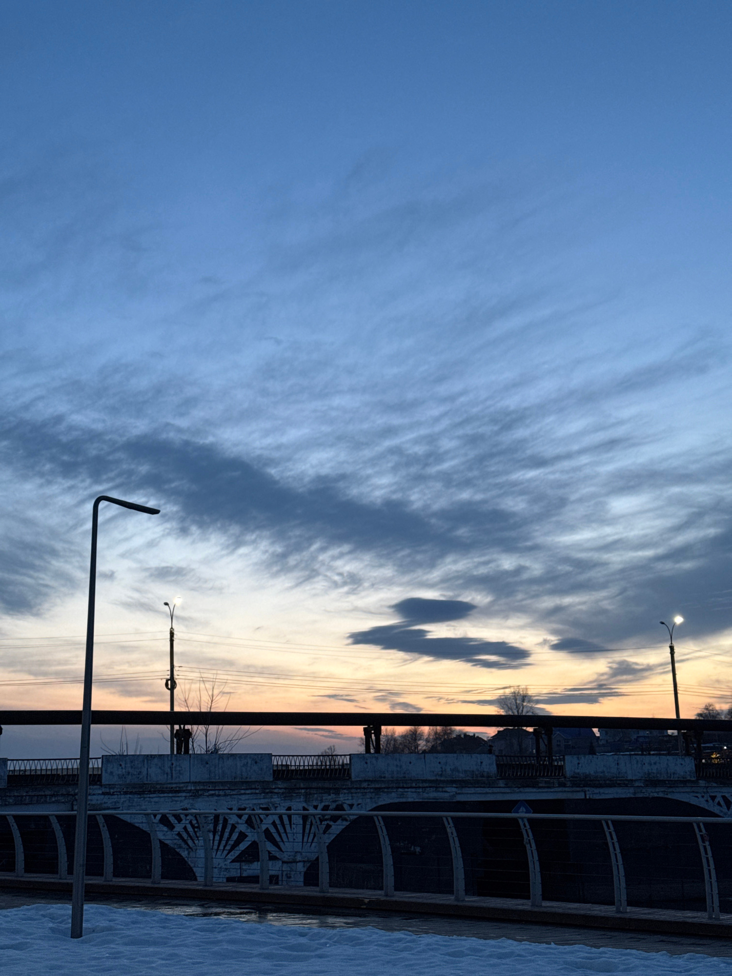 The image depicts an evening sky over the embankment of the Votkinsk Pond in Votkinsk, Russia. Wispy, layered clouds dominate the sky, transitioning from a deep blue in the upper left to lighter huesβ¦read more
