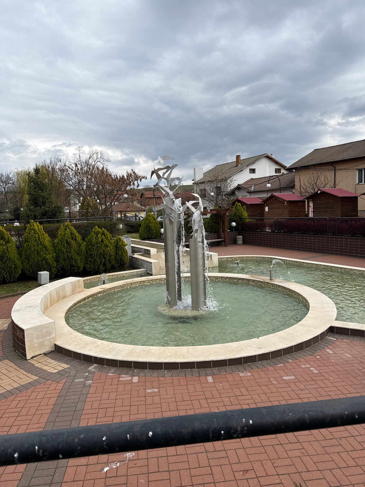 The image displays an outdoor scene in Chavdar, Bulgaria, centered around a decorative fountain under a cloudy sky. In the foreground and midground, a prominent fountain features light-colored, possi…read more