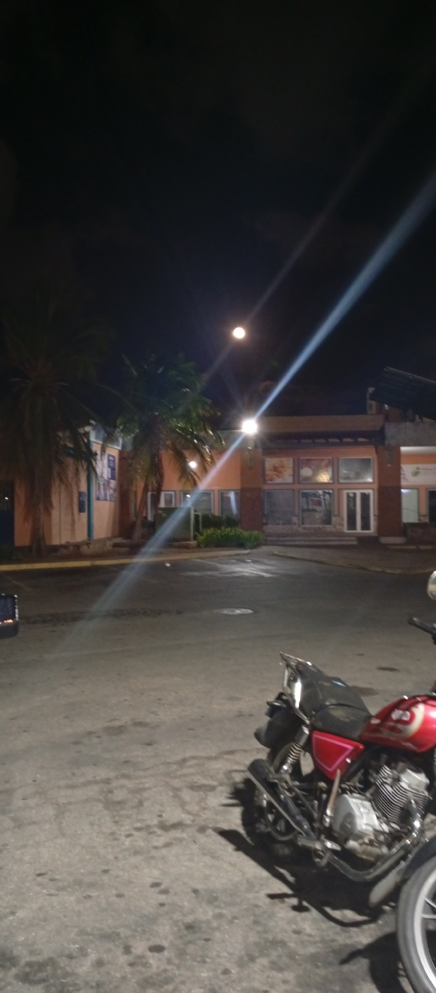 The image shows a dimly lit street scene at night in Juan Griego, Venezuela. A red motorcycle is parked on the asphalt surface in the foreground. Behind the motorcycle, a one-story building is visible…read more