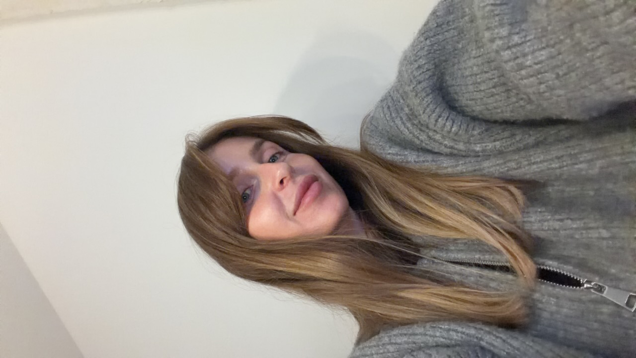 A woman with long brown hair, wearing pink-tinted sunglasses, a pearl necklace, and a sleeveless top with a denim vest, is holding up a phone to take a selfie. She is smiling slightly. Her hair is blo…read more