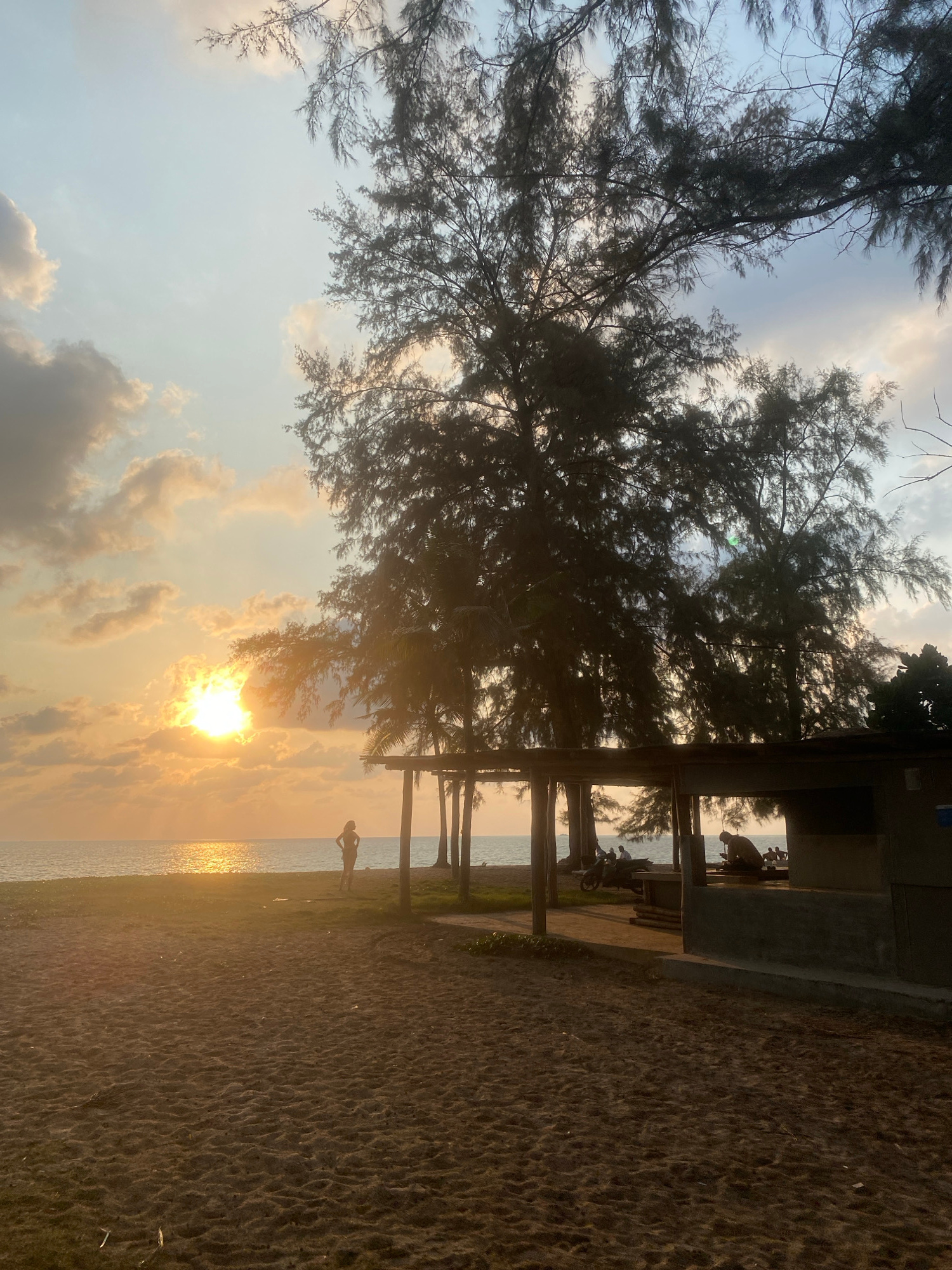 The image captures a tranquil sunset scene on a beach in Choeng Thale, Thailand. The sun, a brilliant golden disc, is low on the horizon, casting a dazzling path of light across the calm waters of theβ¦read more